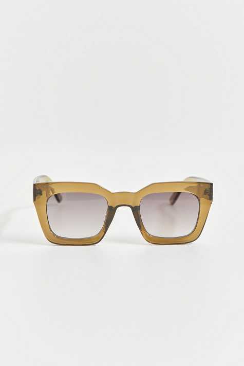 Sunglasses with chunky plastic frames. The sunglasses is green and has tinted glasses with UV400 protection.