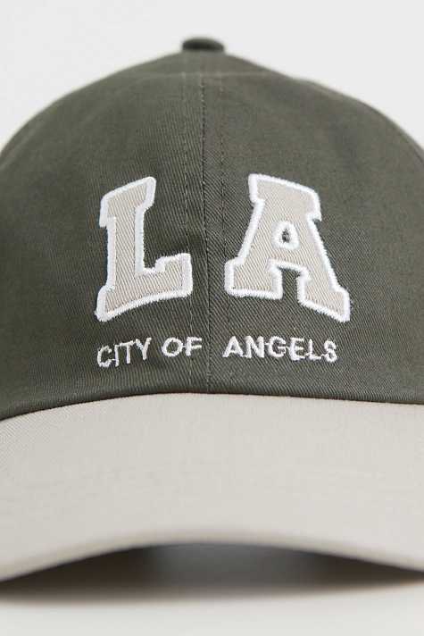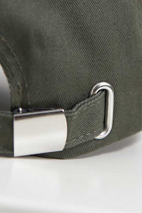Cap in cotton with embroidered text. The cap is green and has adjustable tab with metal buckle at the back.