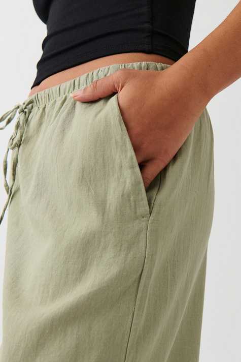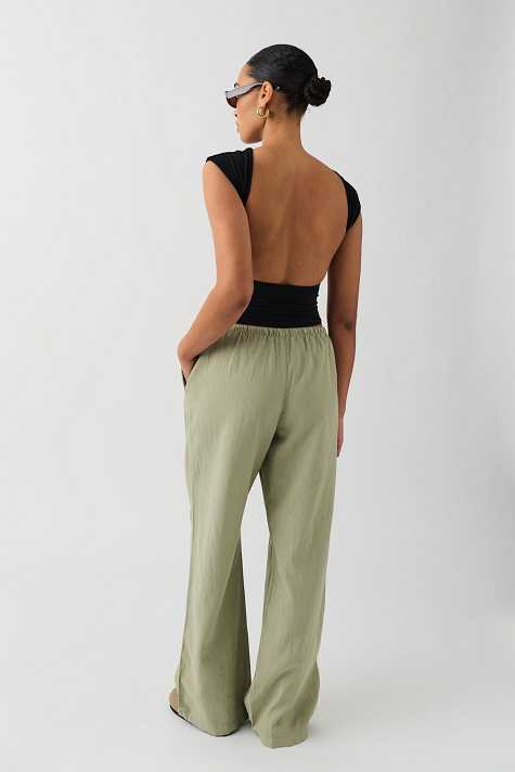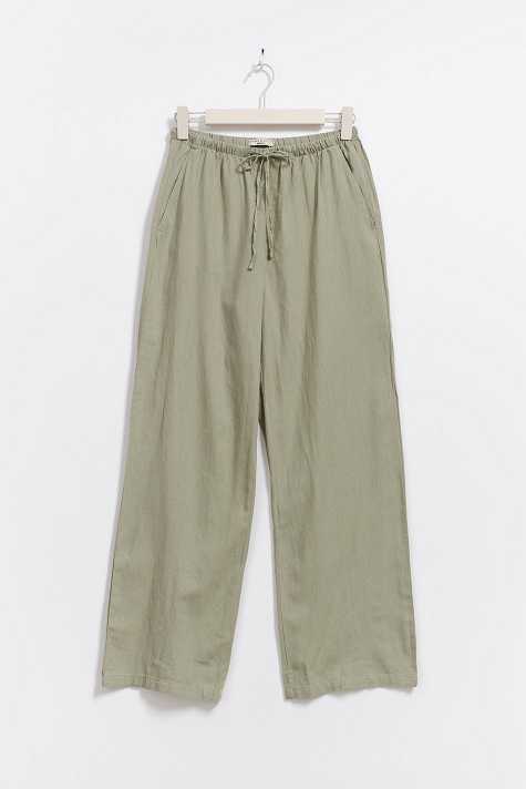 Linen trousers with wide legs. The linen trousers are green and have mid waist. They have side pockets and elastic at the waist with self-tie drawstring at the front.