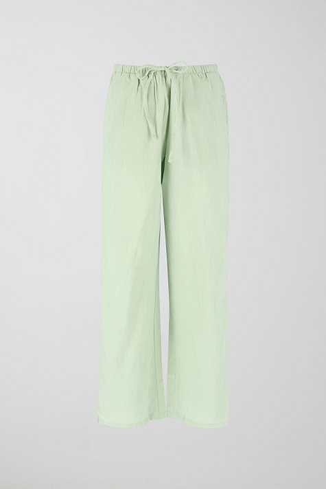 Linen trousers with wide legs. The linen trousers are green and have mid waist. They have side pockets and elastic at the waist with self-tie drawstring at the front.