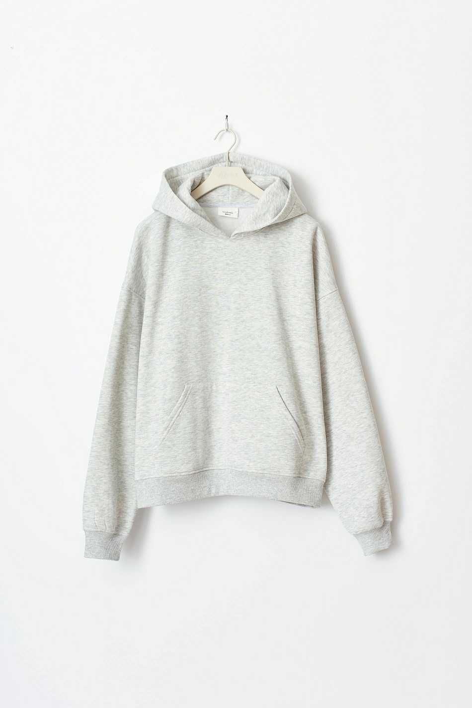 Oversized hoodie with kangaroo pocket at the front. The hoodie is grey and has lined hood with drawstring. It has dropped shoulders and ribbing at sleeve ends and at the bottom.