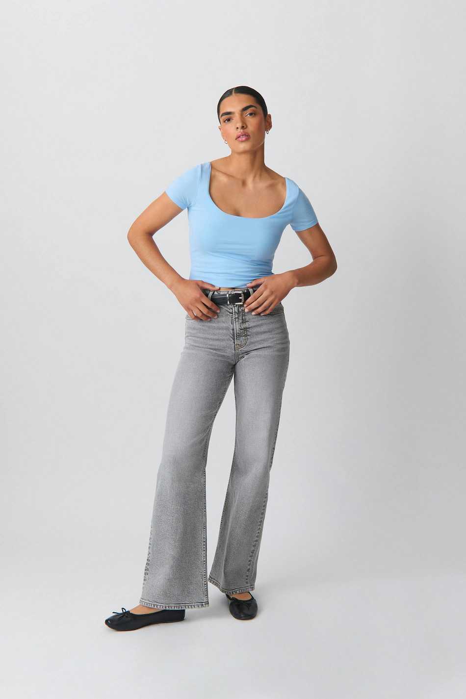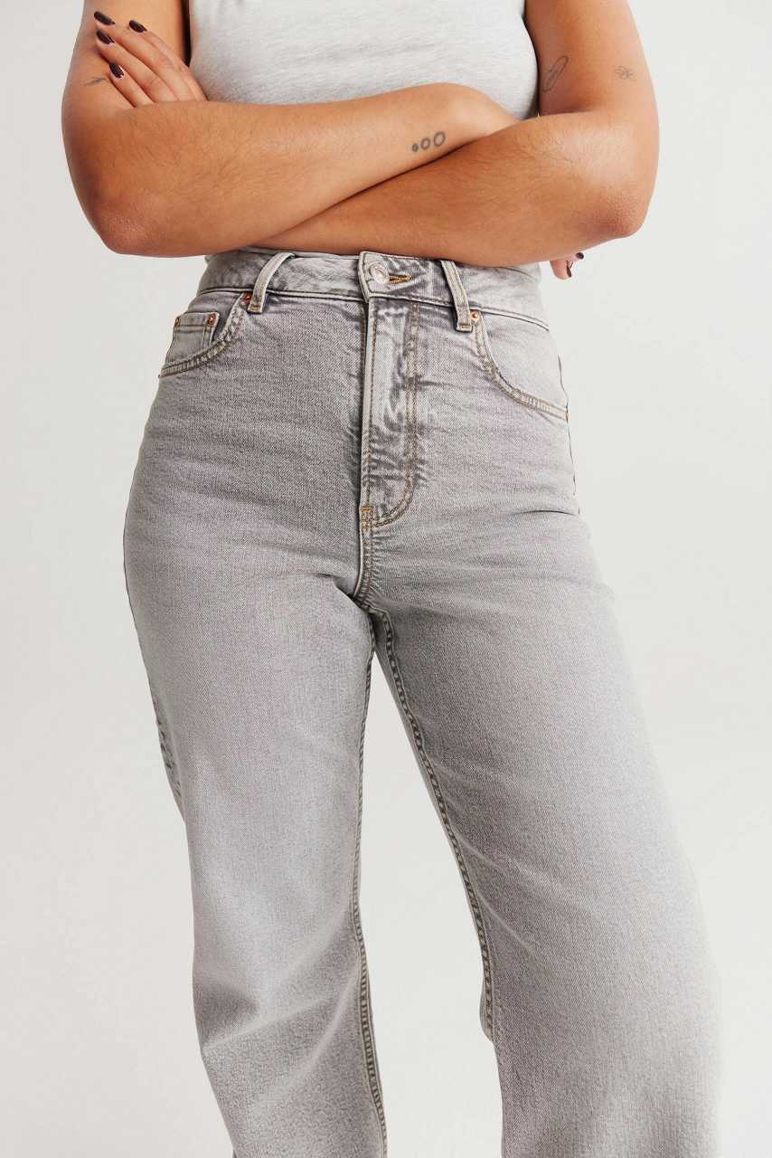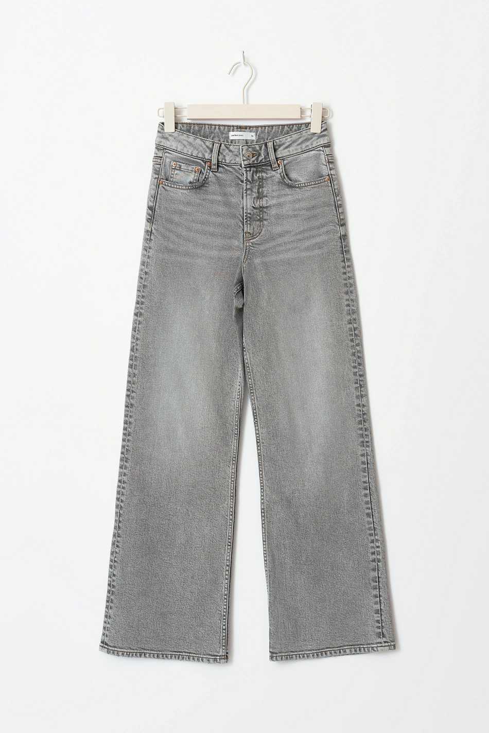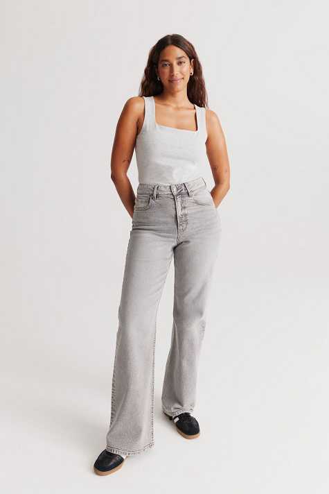 Wide jeans with high waist. The jeans are grey and have stretchy quality. They have zip fly and pockets at the front and back. Use our size guide to find your size.