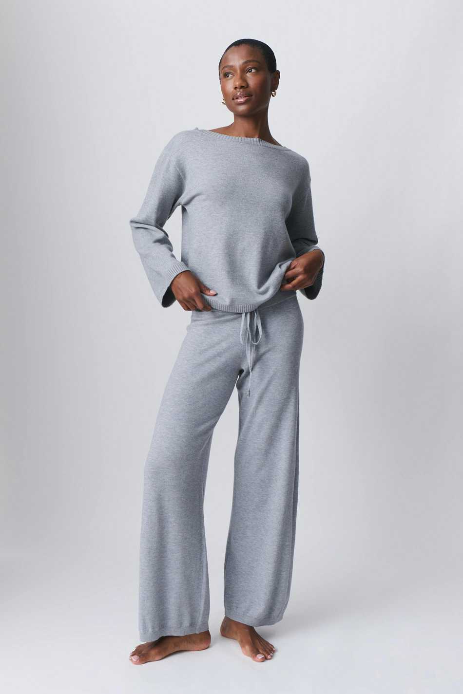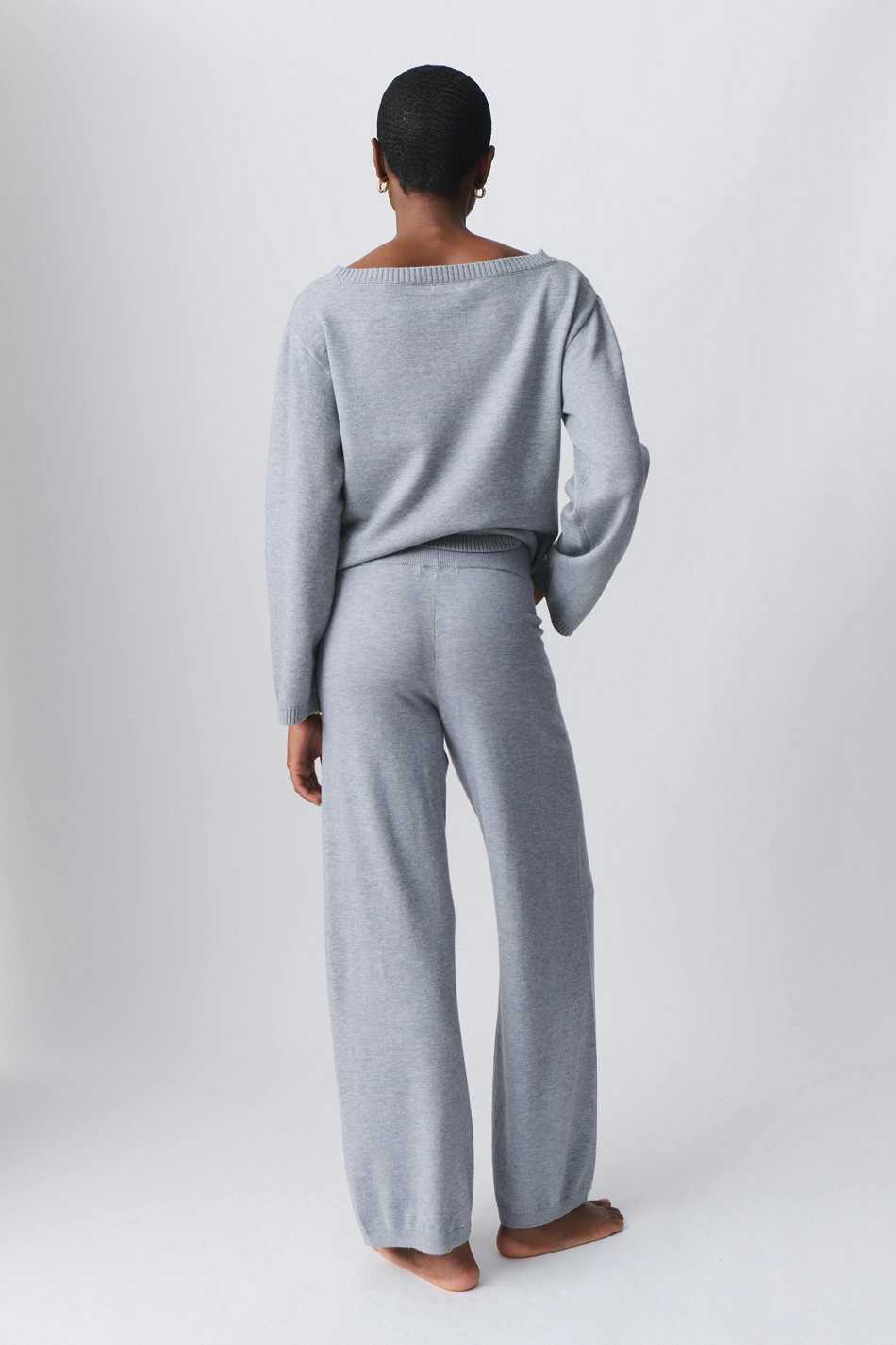 Knitted trousers with elastic at the waist. The trousers are grey and have wide legs. They have mid waist and self-tie at the front.