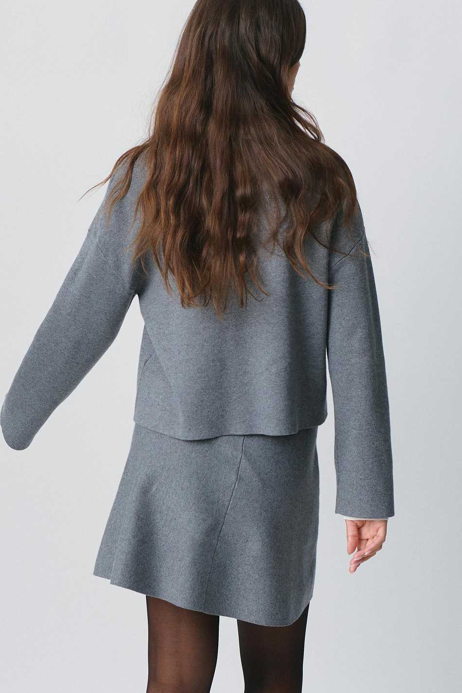 Soft knit cardigan with knot closure at the front. The cardigan is grey and has long sleeve. It has round, ribbed neckline and dropped shoulder.