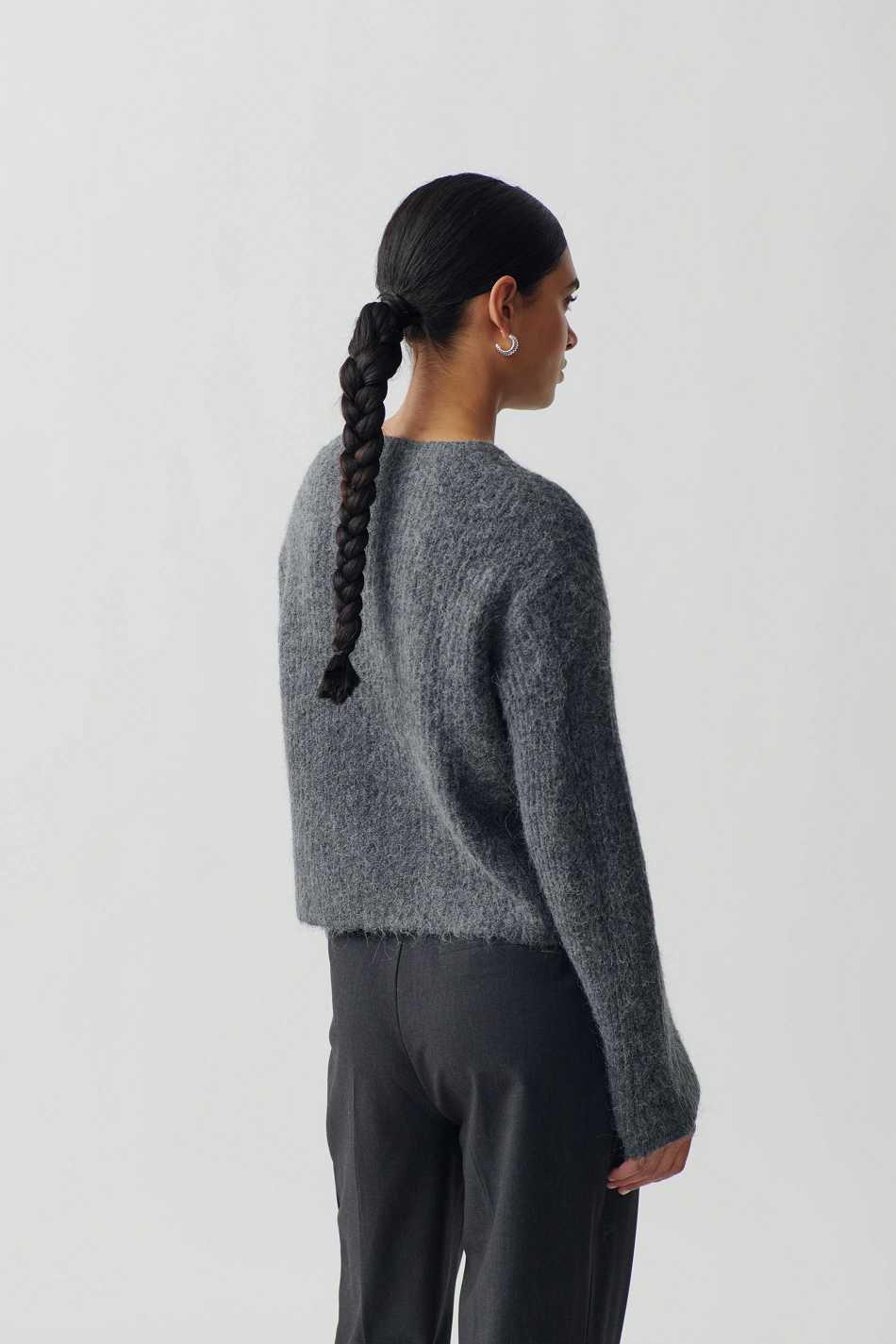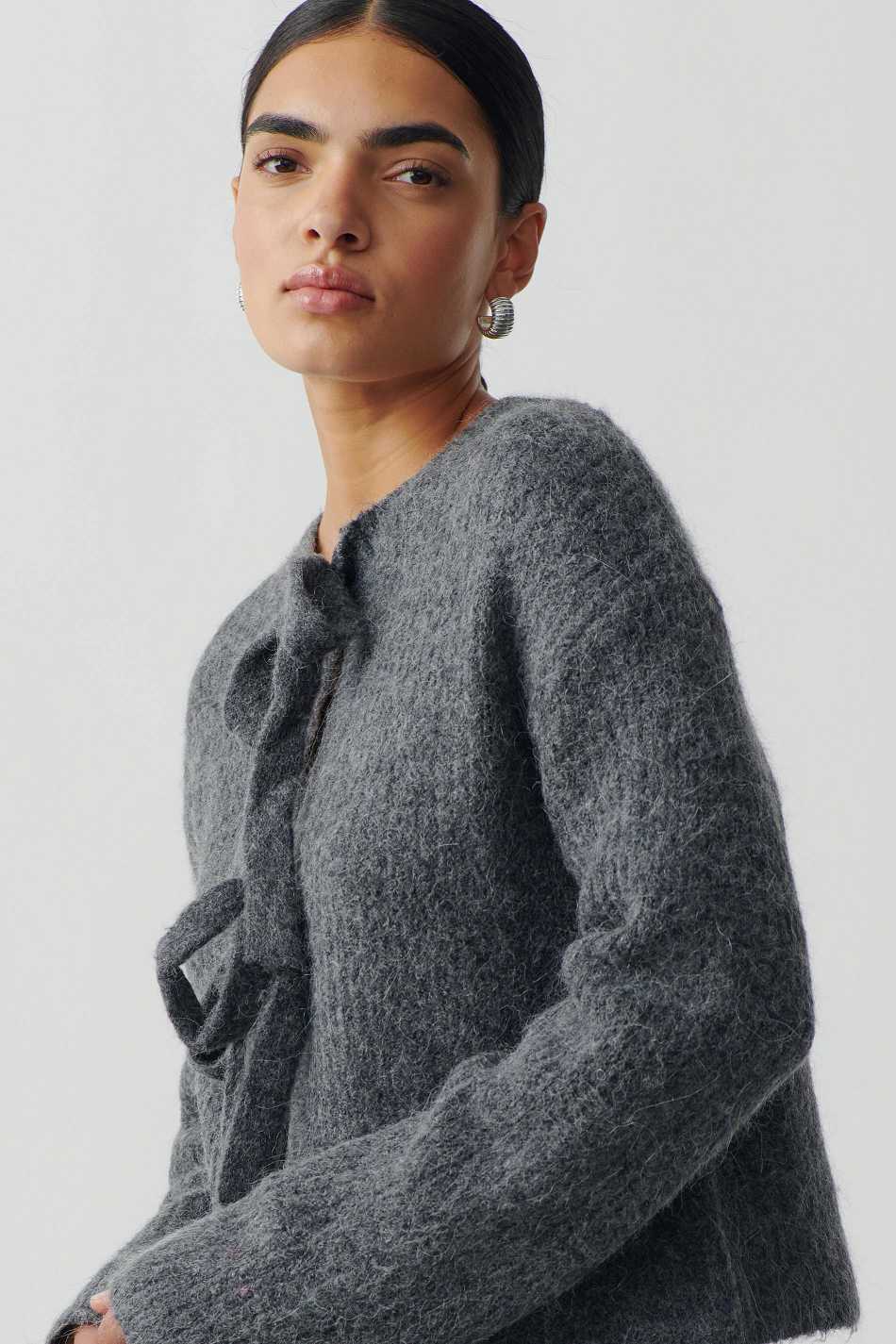 Knit cardigan with string tie closure at the front. The cardigan is grey and has oversize fit. It has round neckline and long sleeve.