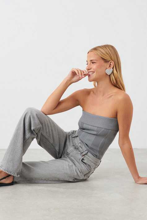 Knitted tube top with figure-hugging fit. The top is grey and has turn-down upper edge.