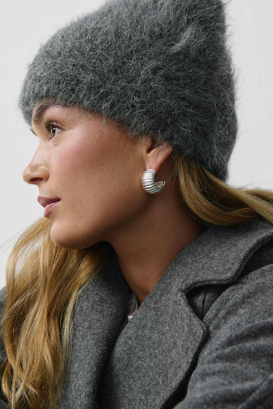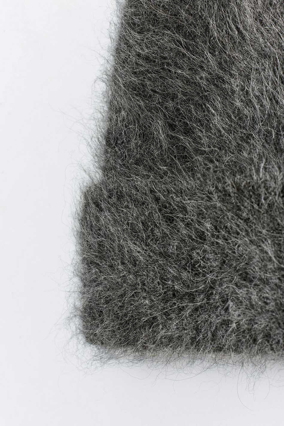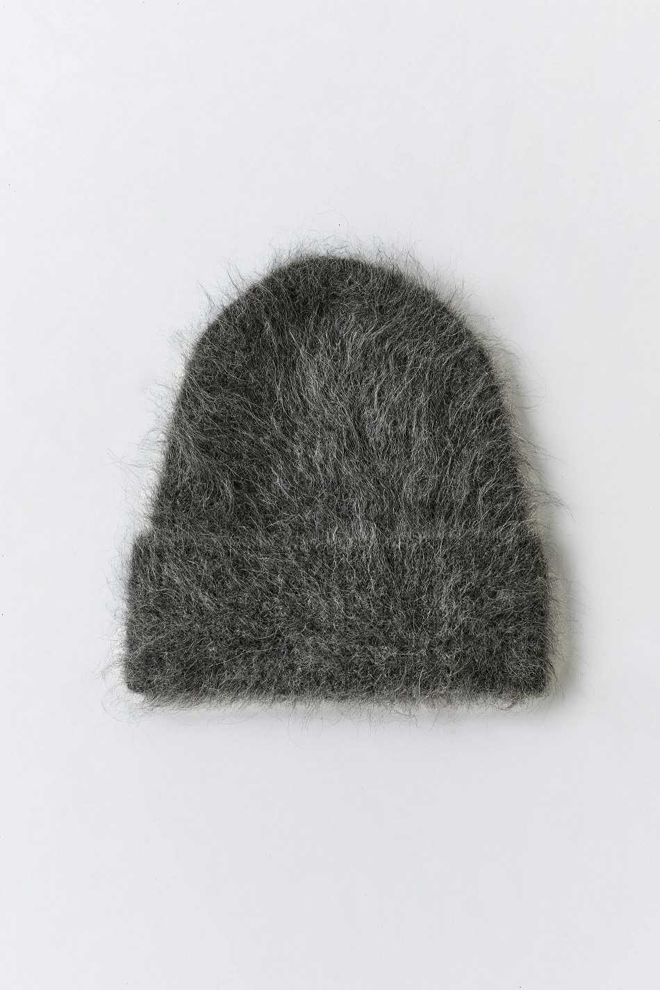 Knitted beanie in soft alpaca blend with fuzzy quality. The beanie is grey.