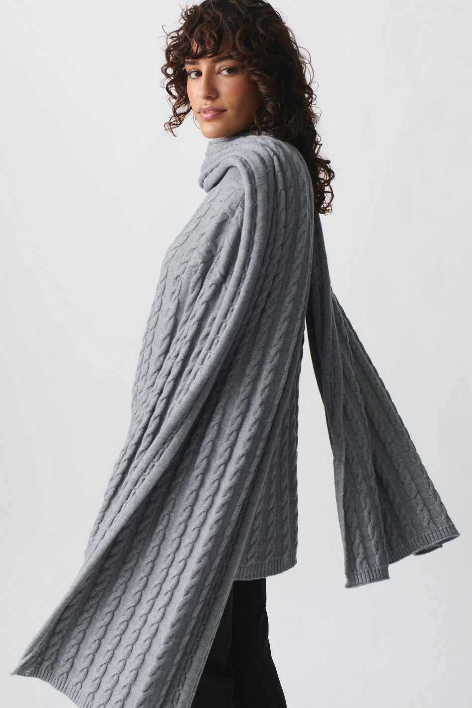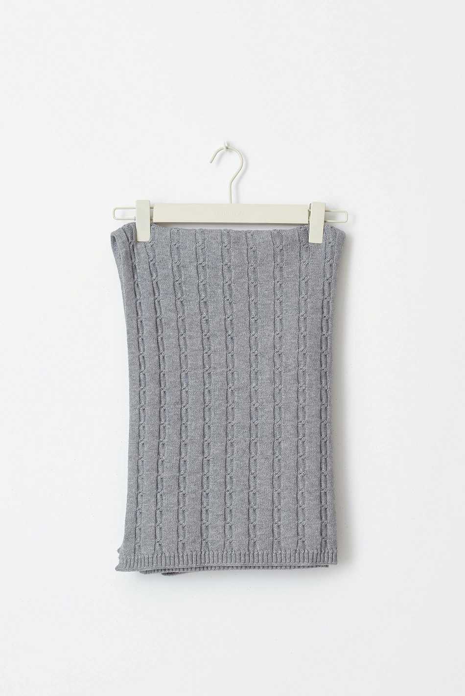 Cable knit scarf with soft quality. The scarf is grey and has ribbed trims.