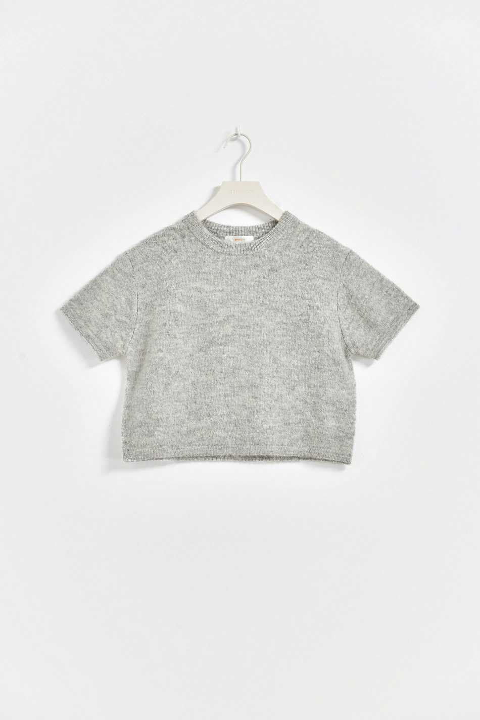 Knitted sweater with short sleeve. The sweat is grey and has loose-fitting style. It has round, rib-knit neckline.