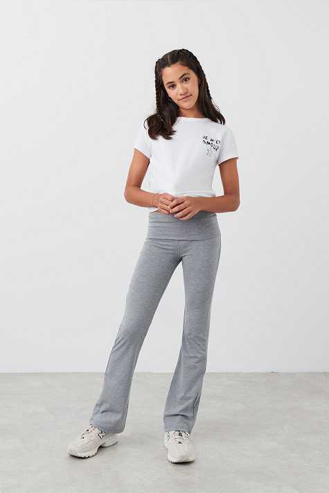 Tall yoga pants by Gina Tricot Young with extra long legs. The trousers are grey and have super soft quality. They have low waist, flared legs and turn-down waistband.