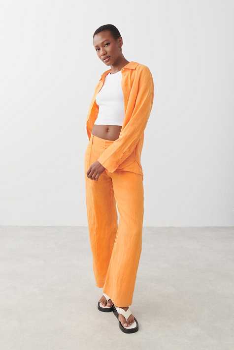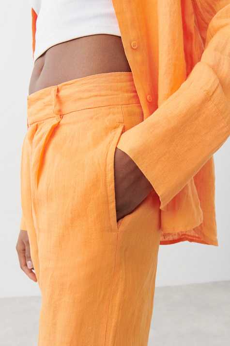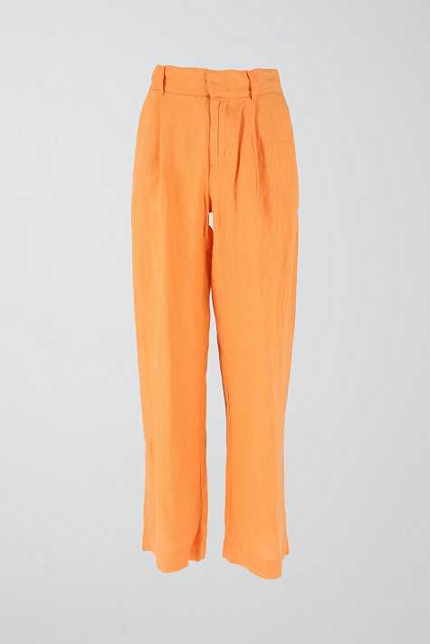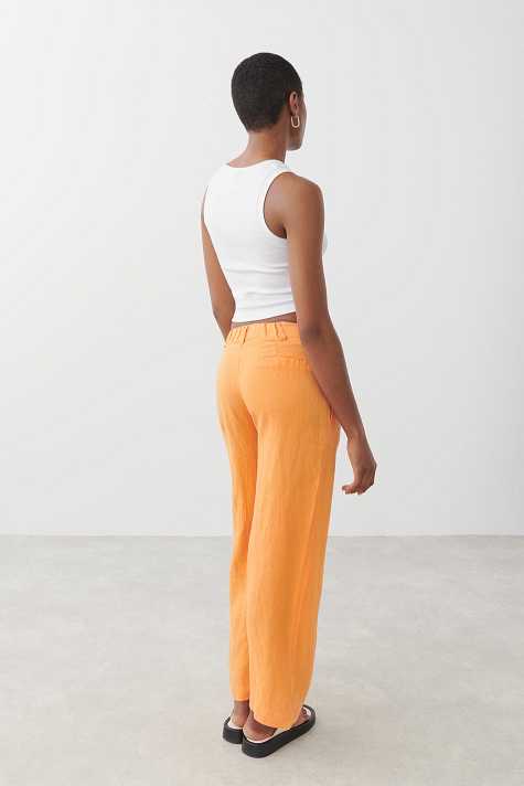 Linen trousers with loose-fitting style. The linen trousers are orange and have pleats at the front. They have straight legs, elastic at the back of the waist, belt loops, side pockets and a welt pocket at the back.
