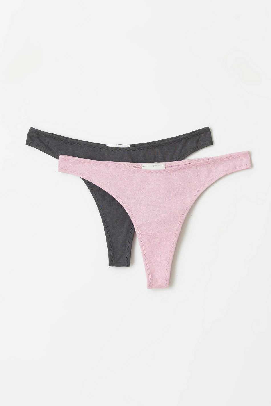 Thongs in lurex and cotton with crotch lining. The thongs are pink and grey.