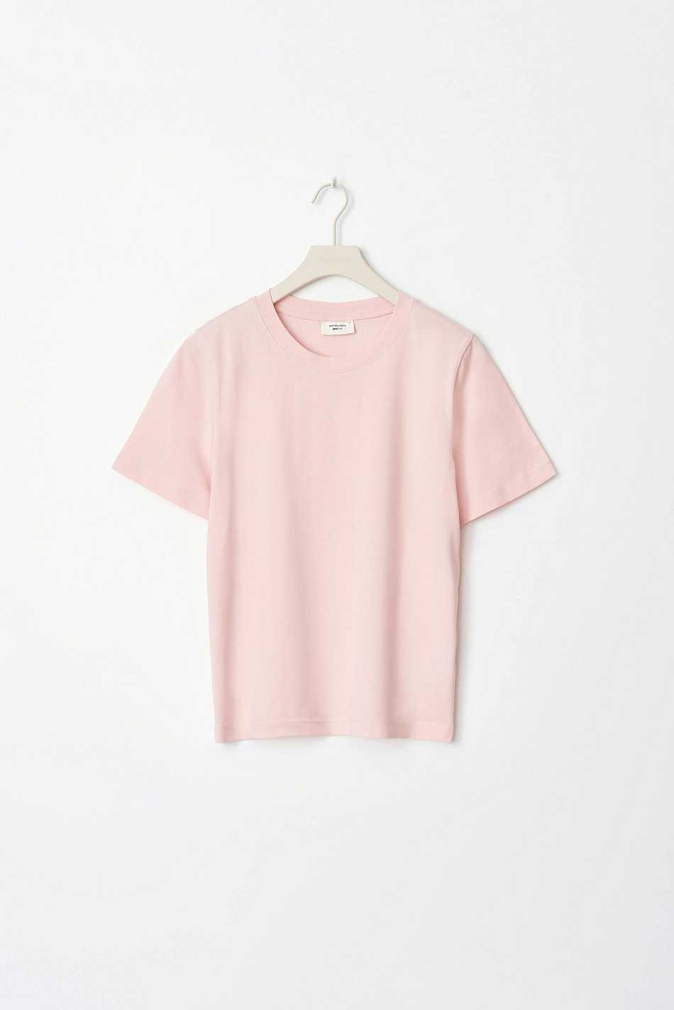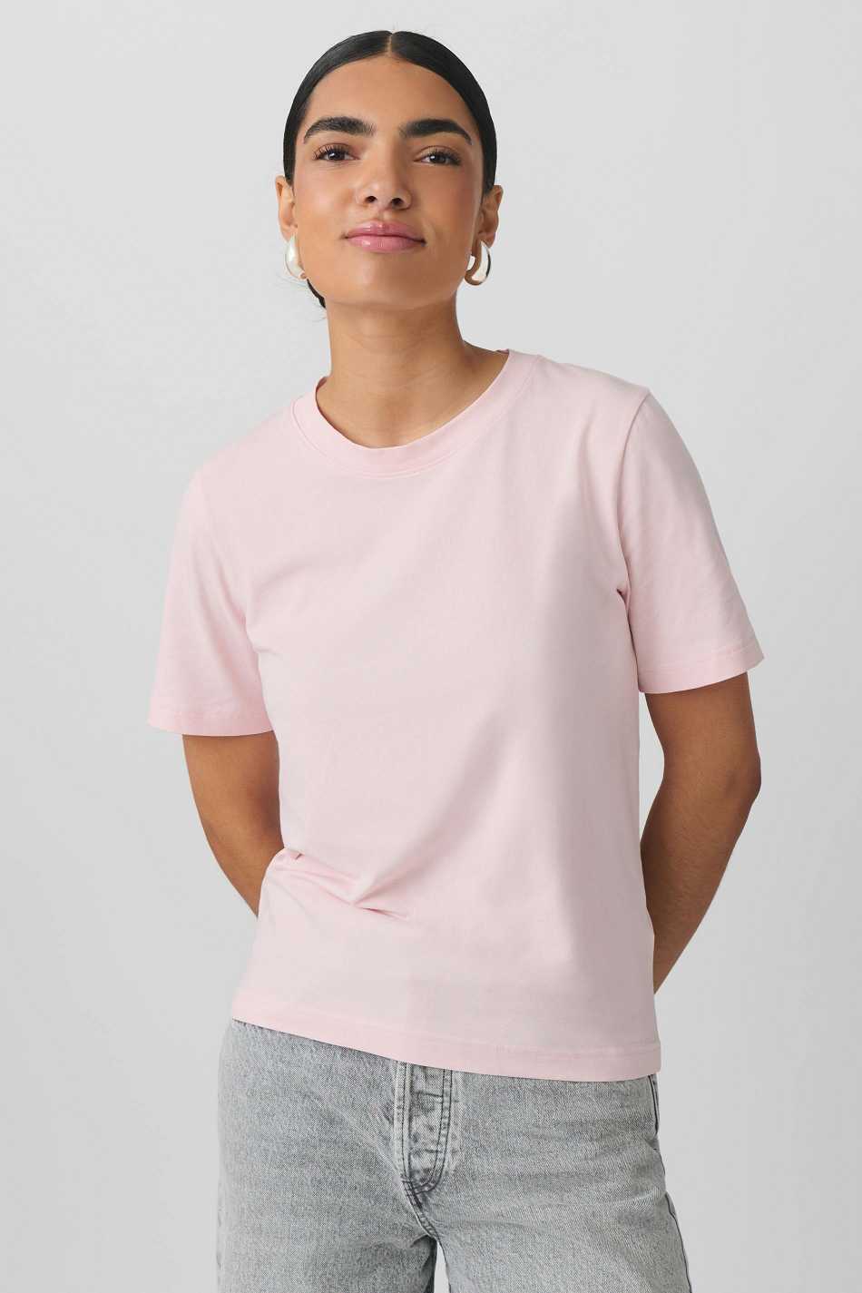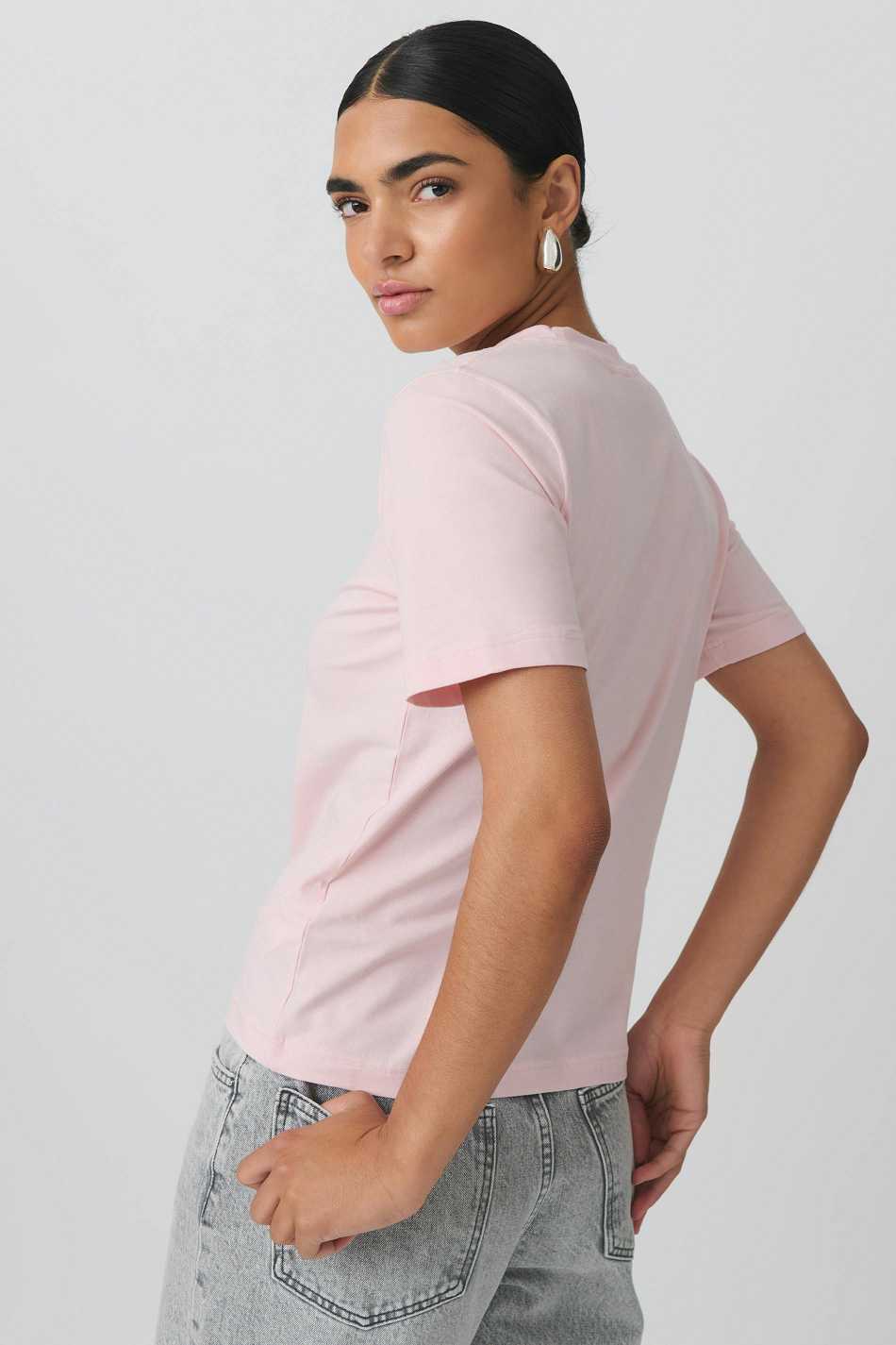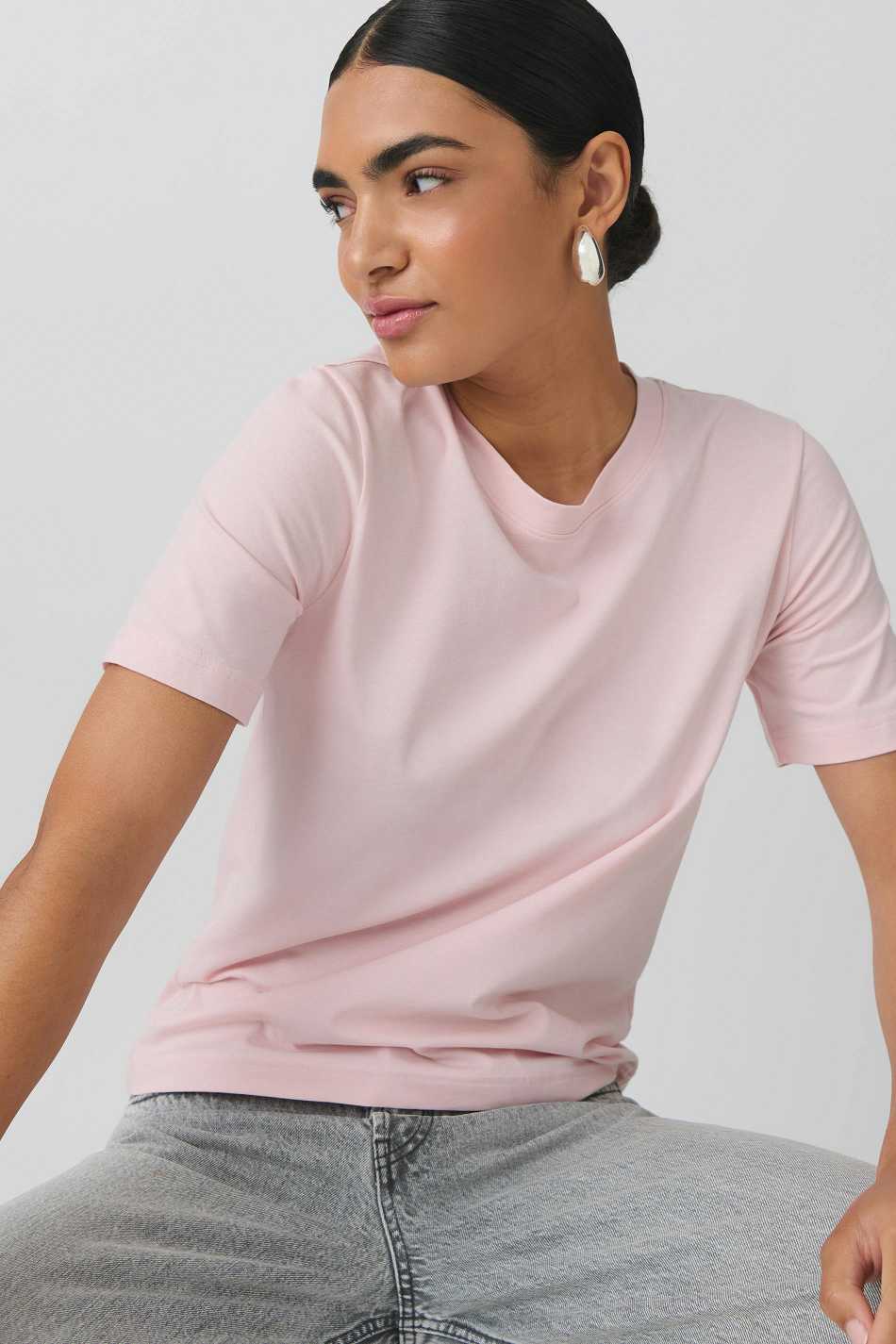Soft t-shirt with normal fit. The t-shirt is pink and has rounded neckline.