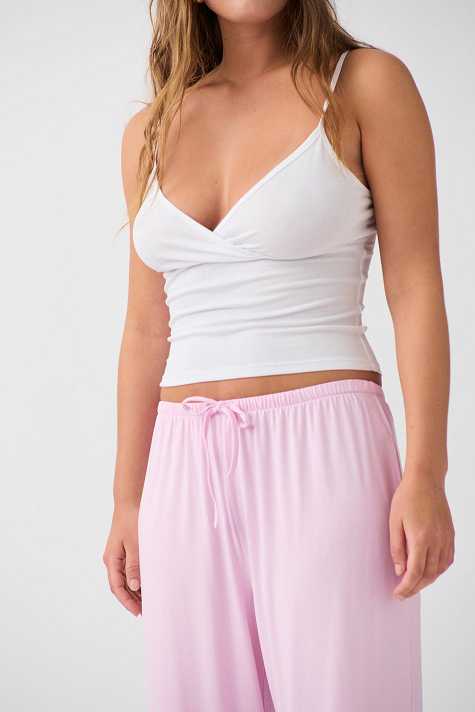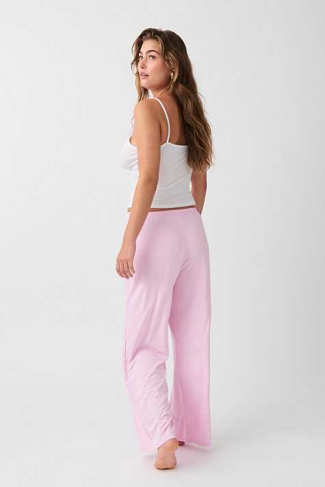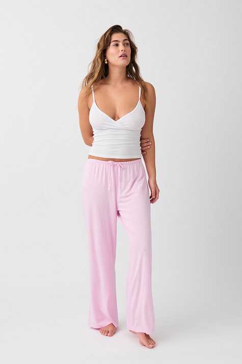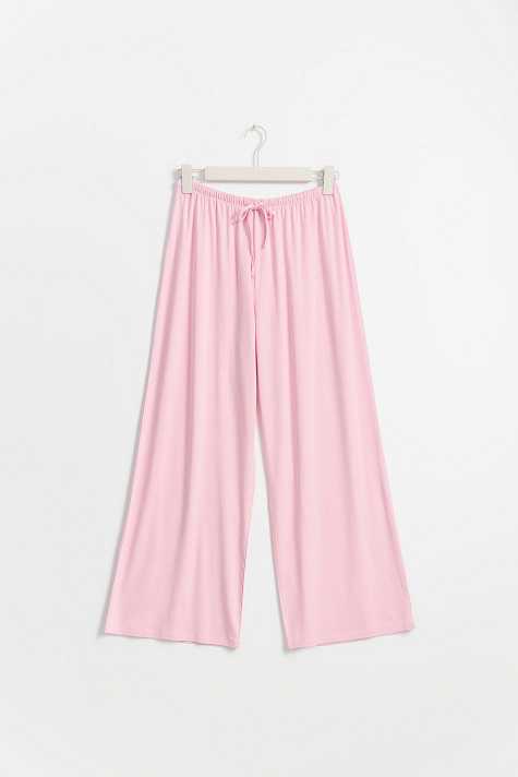 Wide trousers with self-tie drawstring at the waist. The trousers are pink and have loose-fitting style.