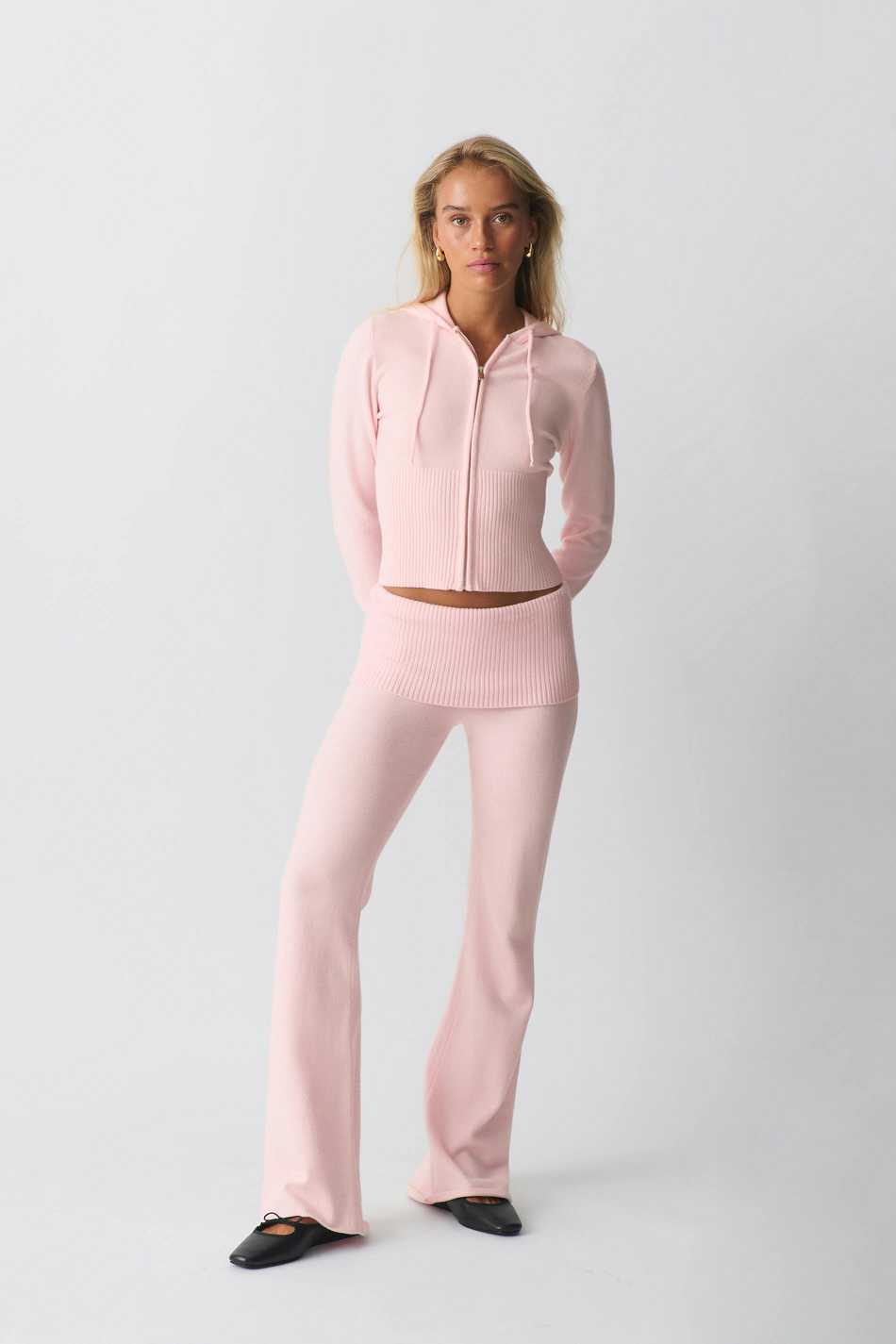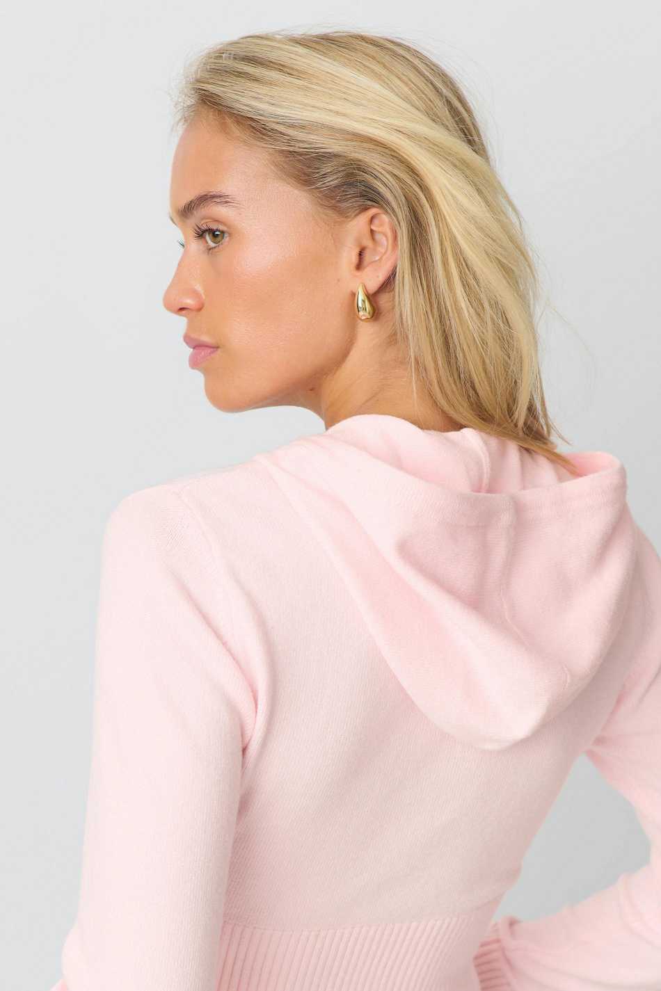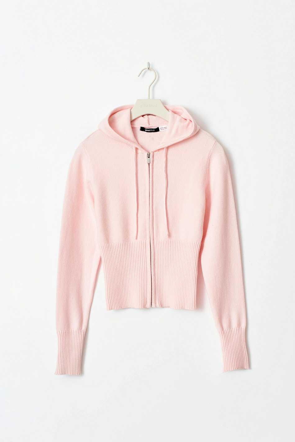 Knitted jacket with zip closure at the front. The jacket is pink and has long sleeve. It has regular fit.