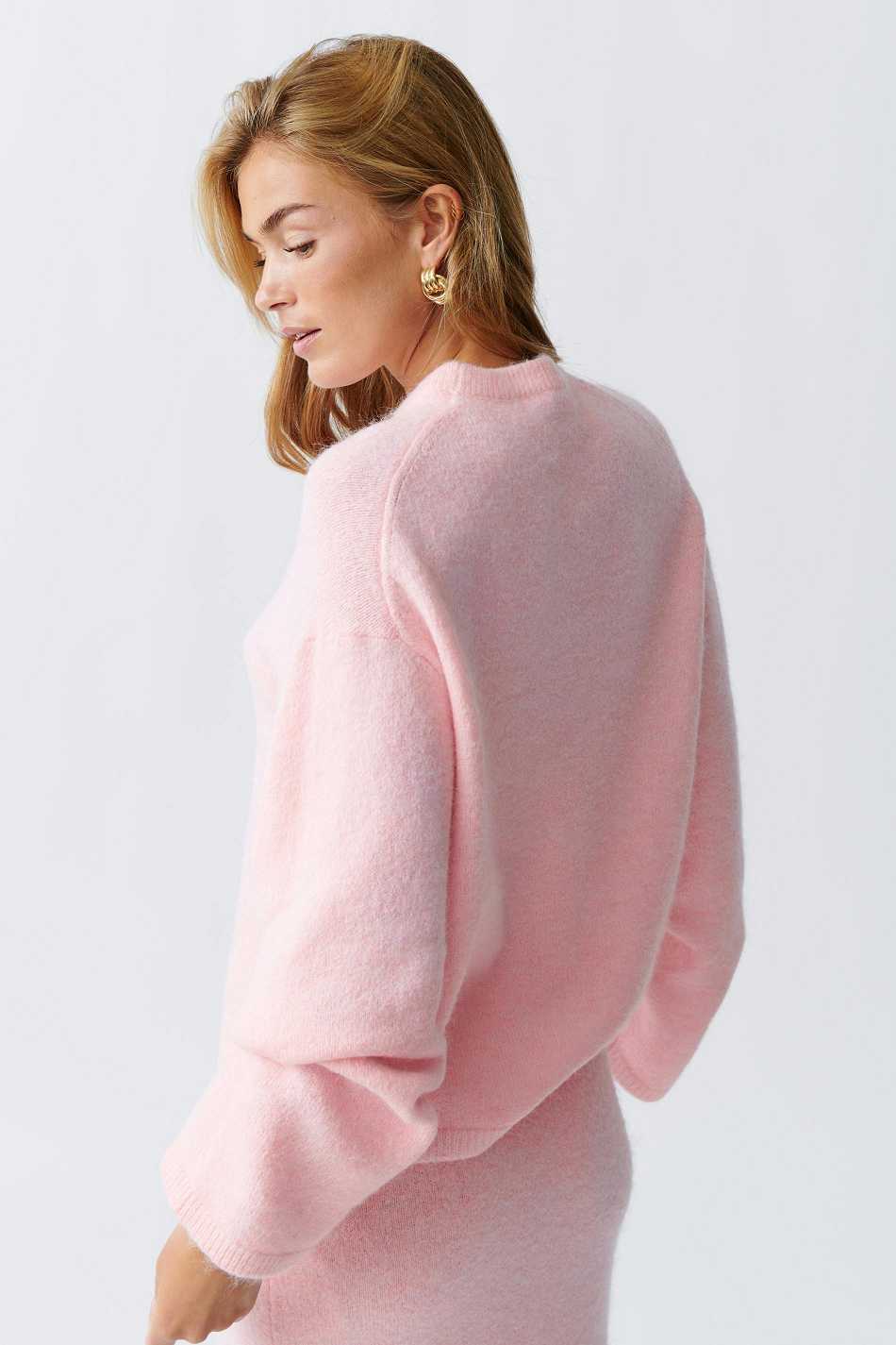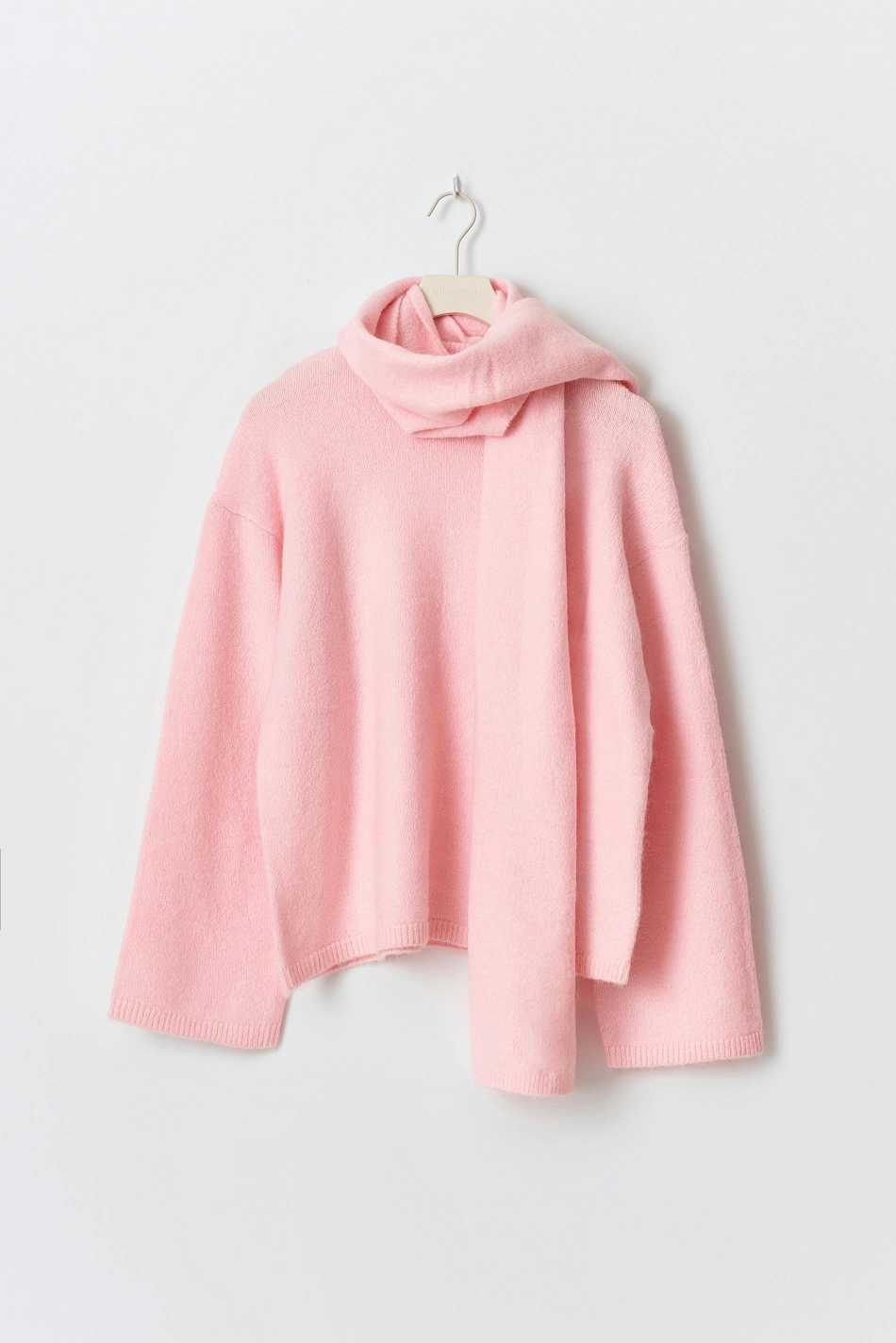 Knitted sweater with detachable scarf. The sweat is pink and has oversize fit. It has long sleeve and dropped shoulder.
