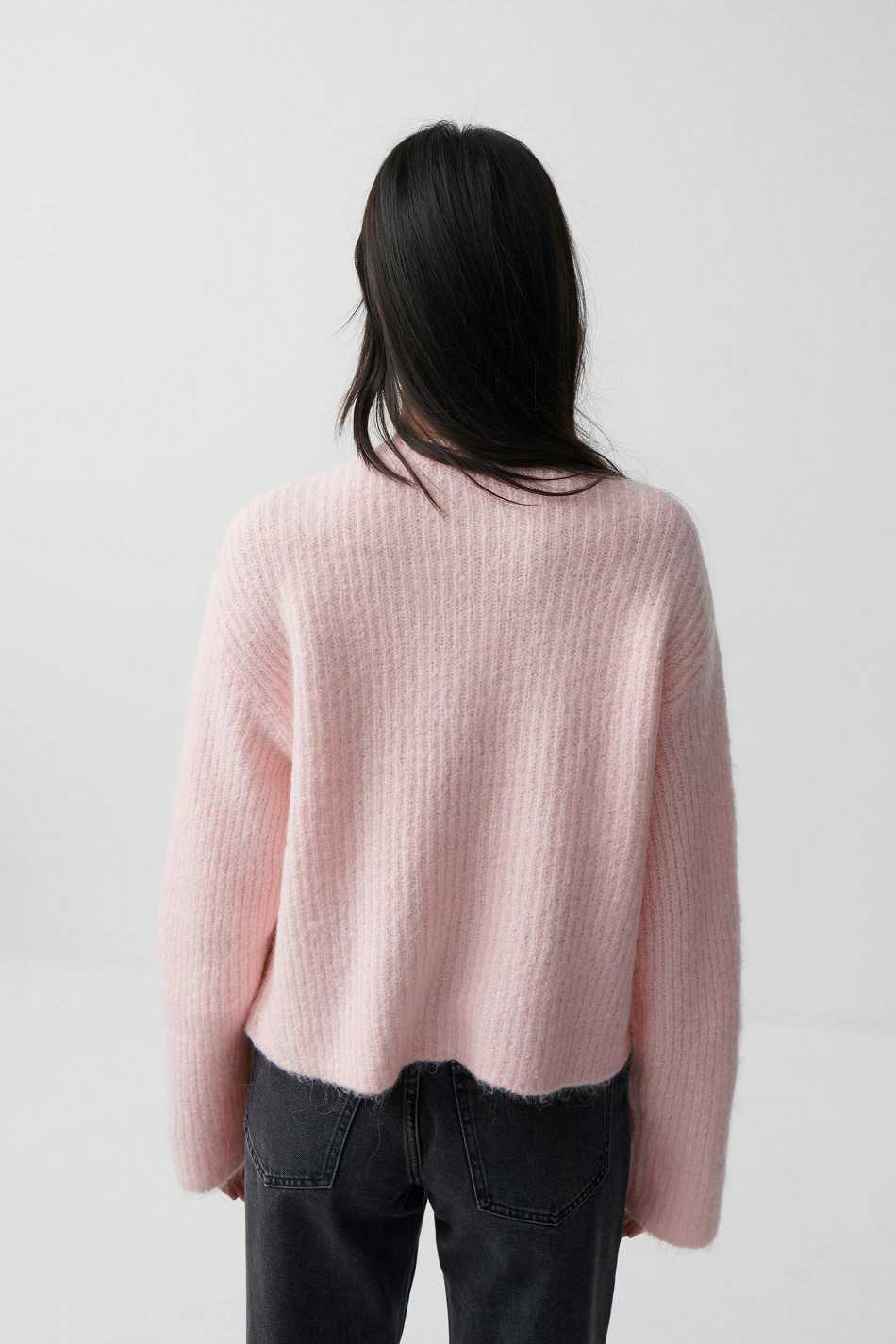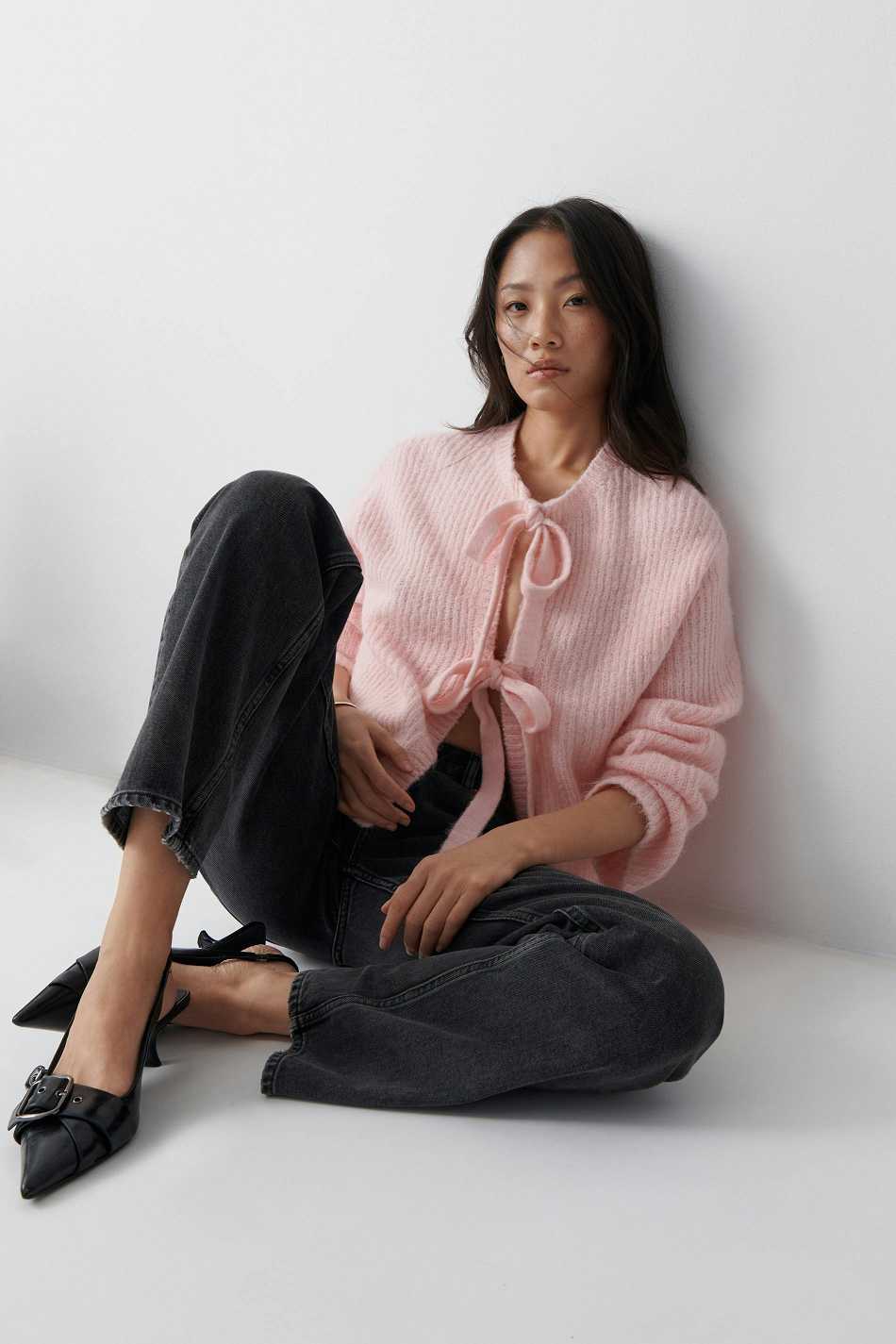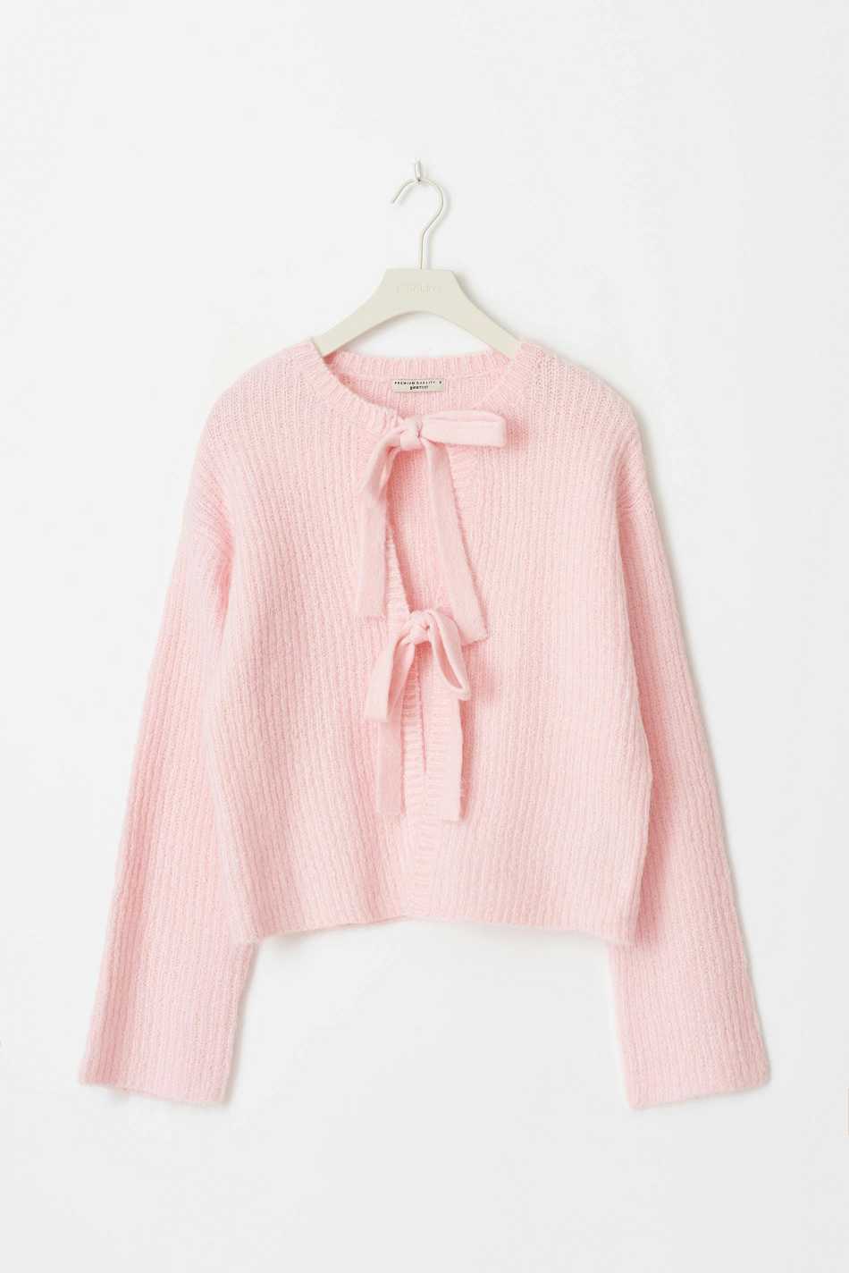 Knit cardigan with string tie closure at the front. The cardigan is pink and has oversize fit. It has round neckline and long sleeve.