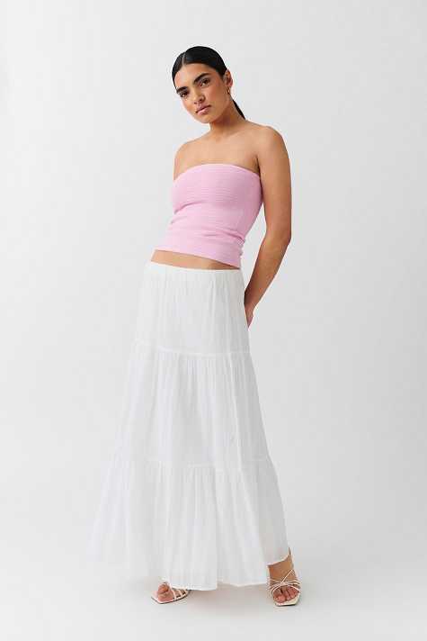 Knitted tube top with figure-hugging fit. The top is pink and has structured material. It has regular length.