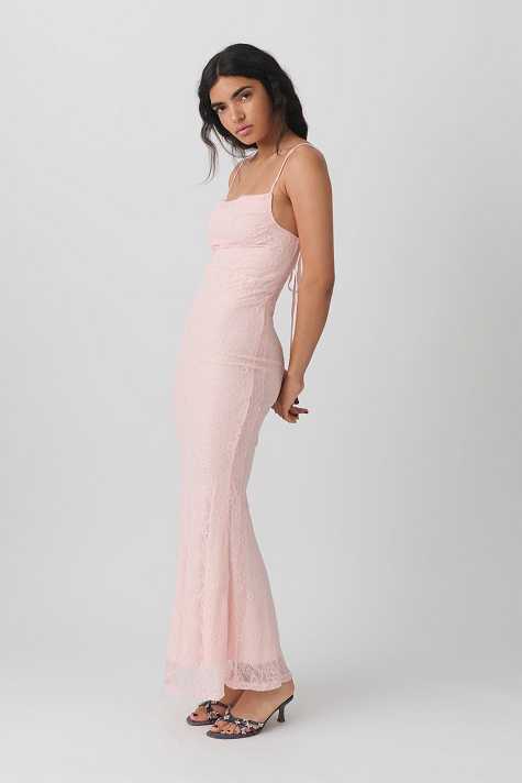 Long dress with open back. The dress is pink, sleeveless and lined. It has cowl neck, narrow shoulder straps and self-tie at the back.
