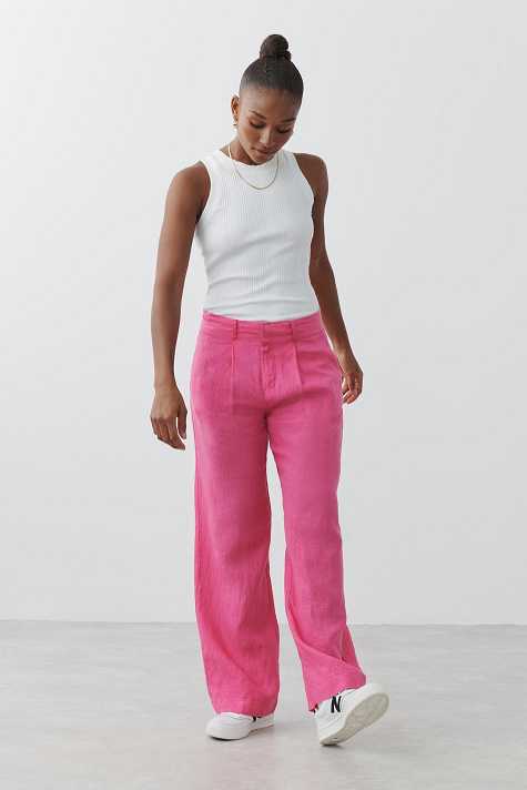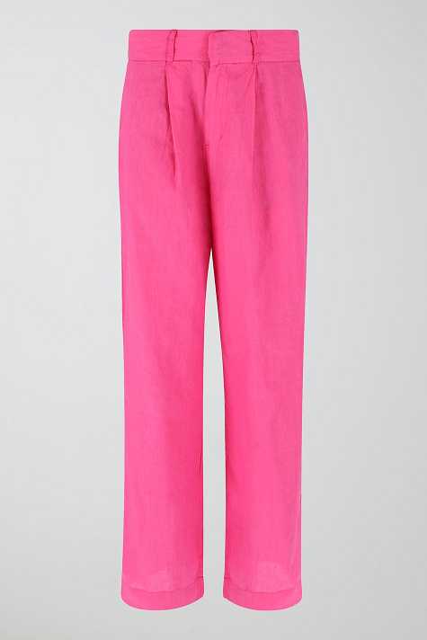 Linen trousers with loose-fitting style. The linen trousers are pink and have pleats at the front. They have straight legs, elastic at the back of the waist, belt loops, side pockets and a welt pocket at the back.