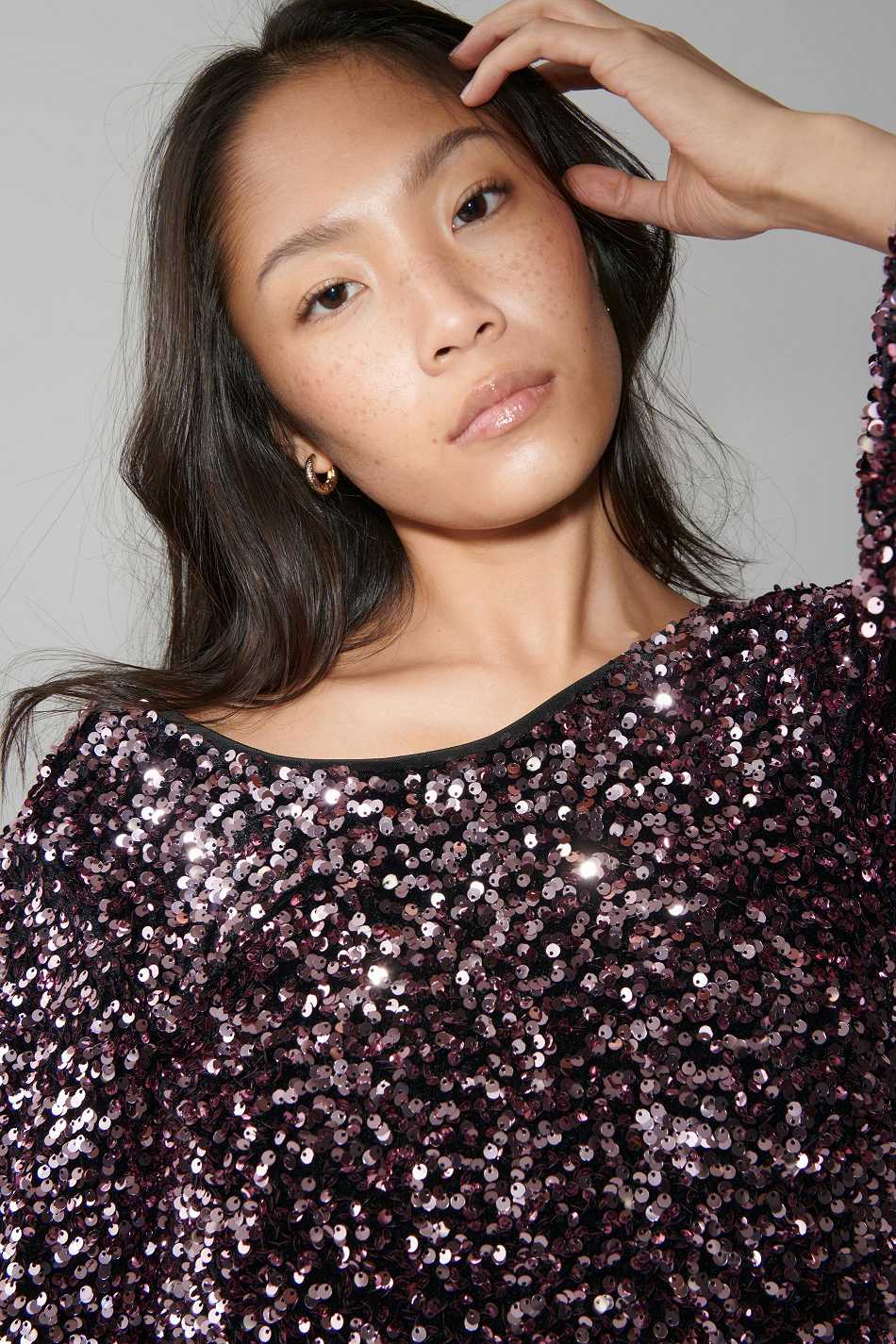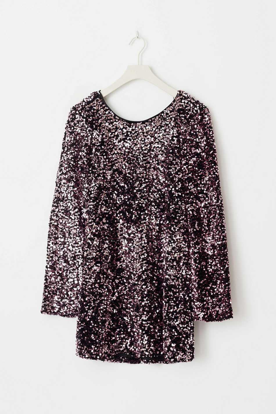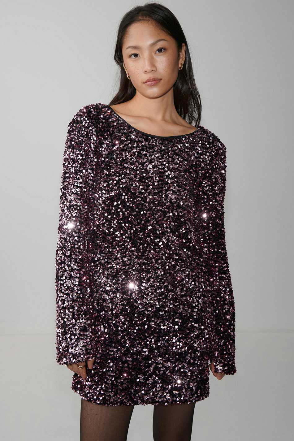 Short sequin dress with open back. The dress is pink and has long sleeve. It has round neckline and loose-fitting style. Lined.