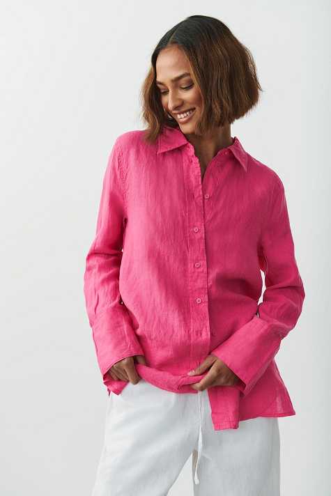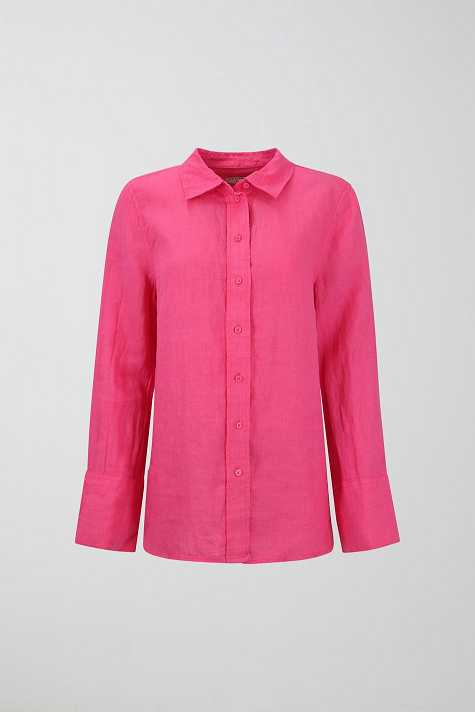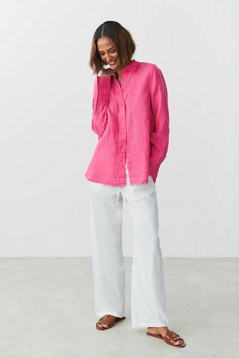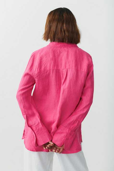 Linen shirt with oversize fit. The shirt is pink and has button placket in front. It has collar, yoke with pleats at the back and long sleeve with button and cuff.
