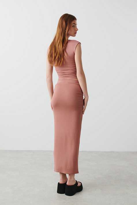 Soft touch – second skin comfort. Maxi skirt in soft viscose with ruching in the sides. The skirt is pink and has figure-hugging fit.
