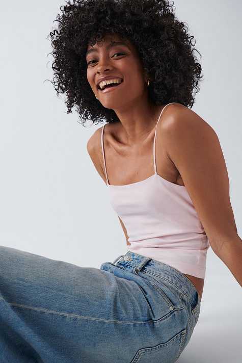 Short singlet with straight upper edge. The singlet is pink and has slim shoulder straps.