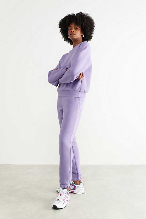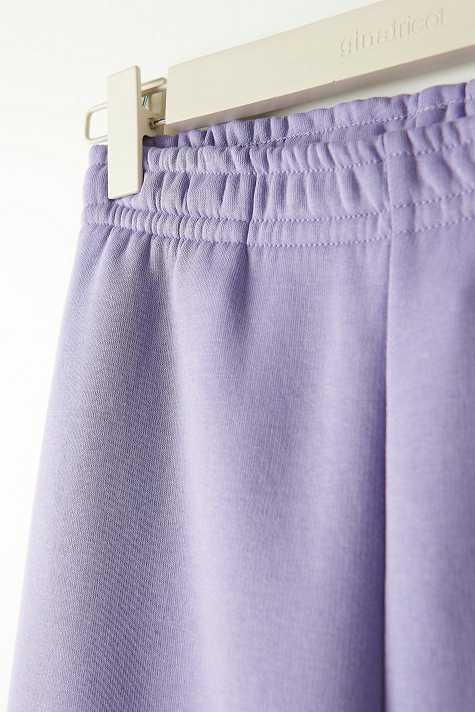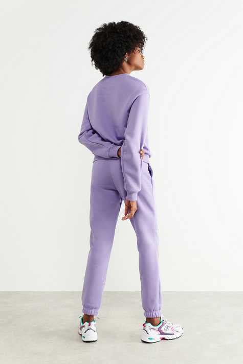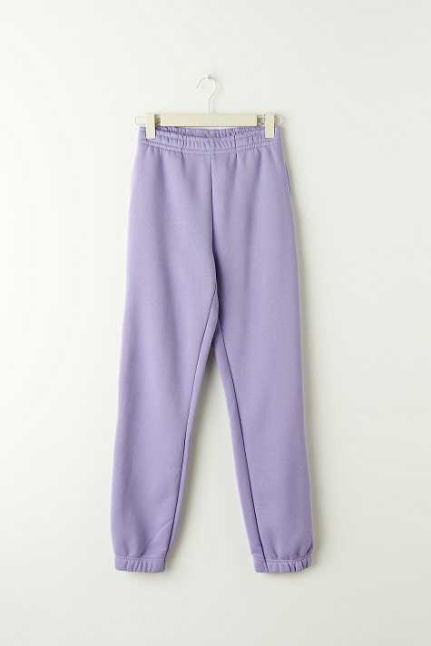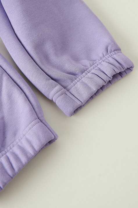 Tracksuit trousers with normal fit. The trousers are purple and have pockets on the sides. They have an elastic band at the waist and at the end of the legs.