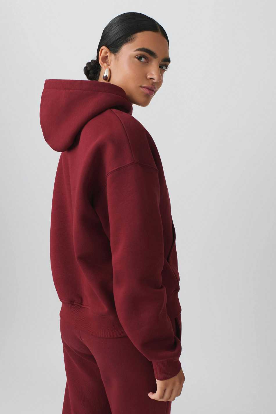 Oversized hoodie with kangaroo pocket at the front. The hoodie is red and has lined hood with drawstring. It has dropped shoulders and ribbing at sleeve ends and at the bottom.