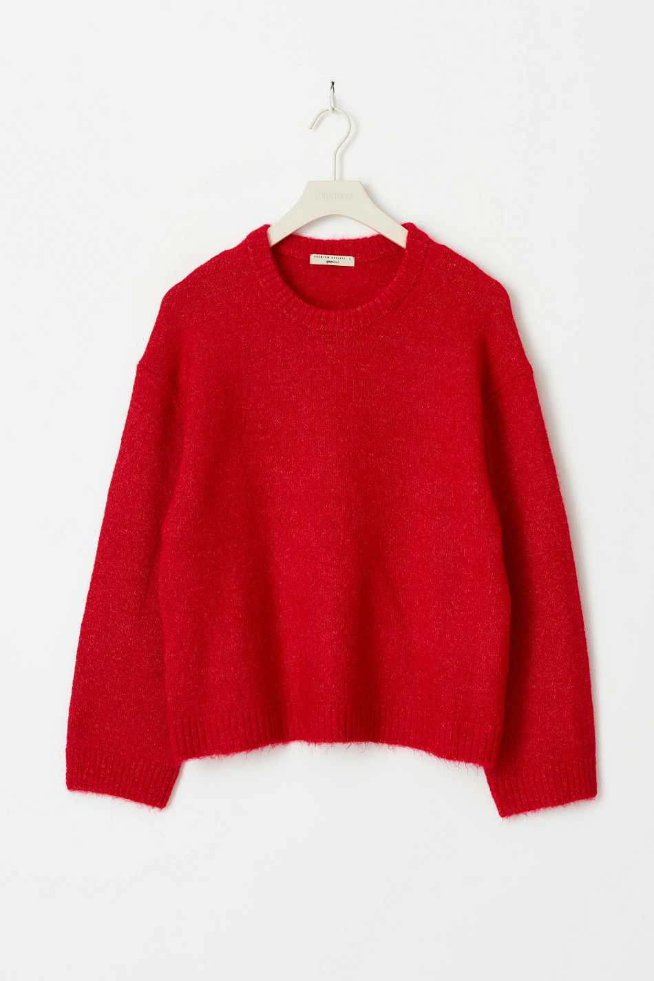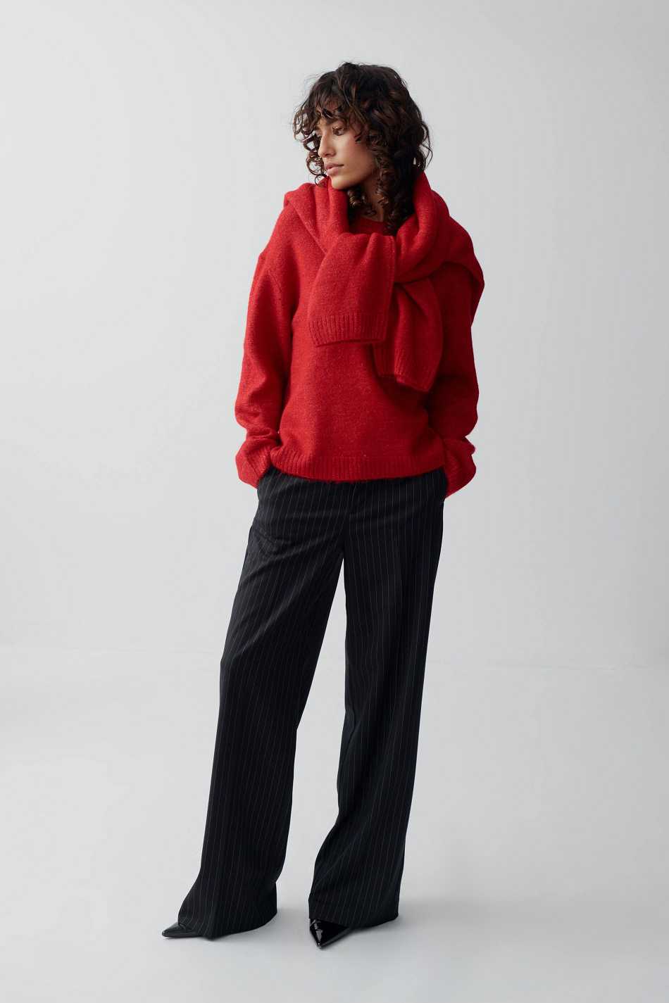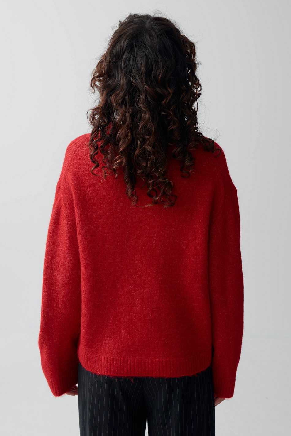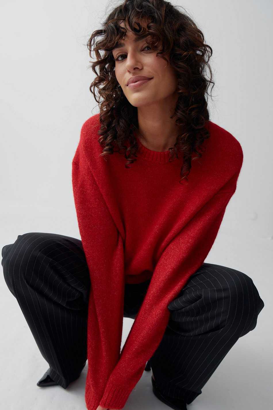 Knitted sweater with round neckline. The sweat is red and has oversize fit. It has balloon sleeve, regular length and rib knit at sleeve ends and at the bottom.
