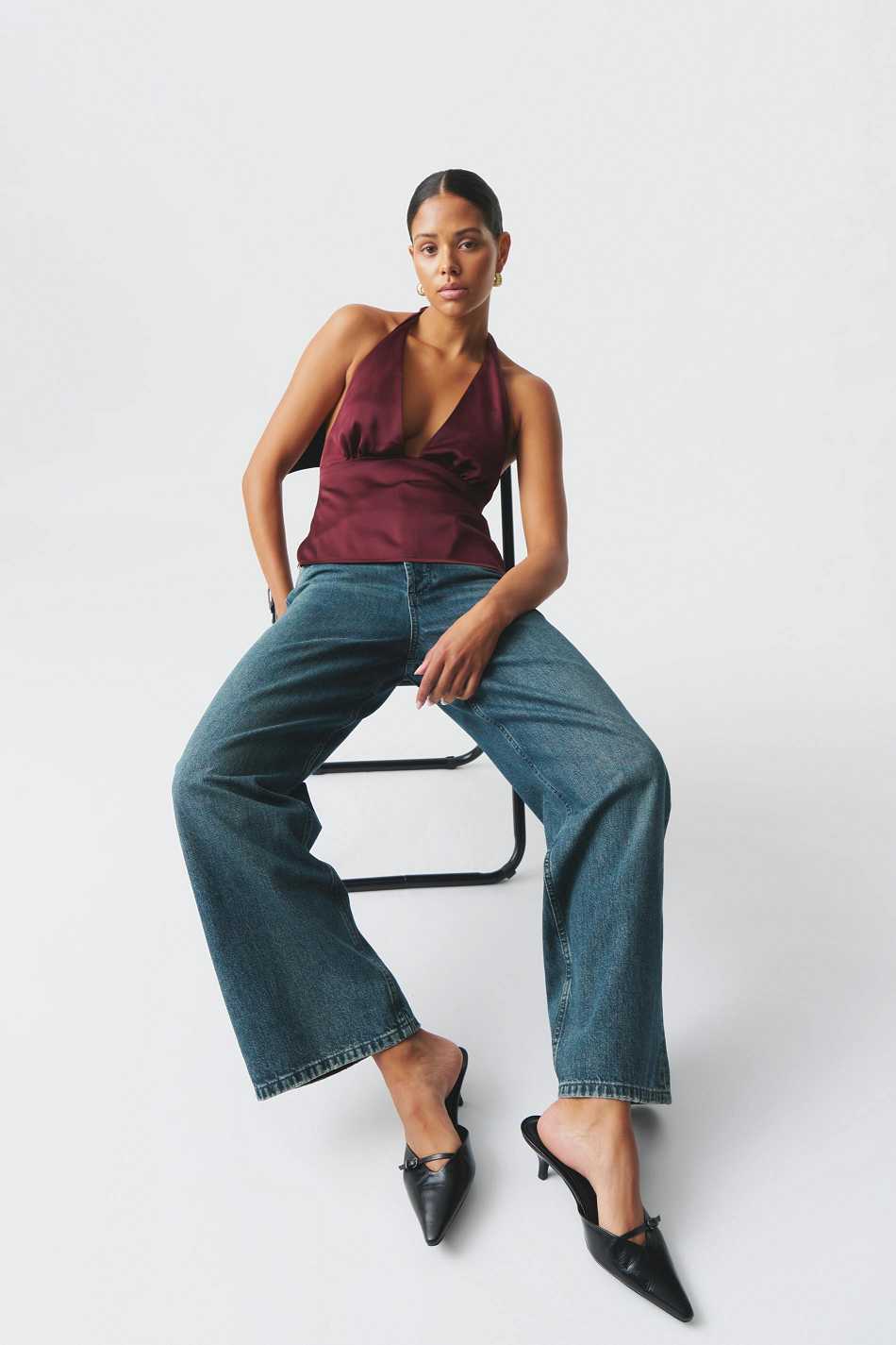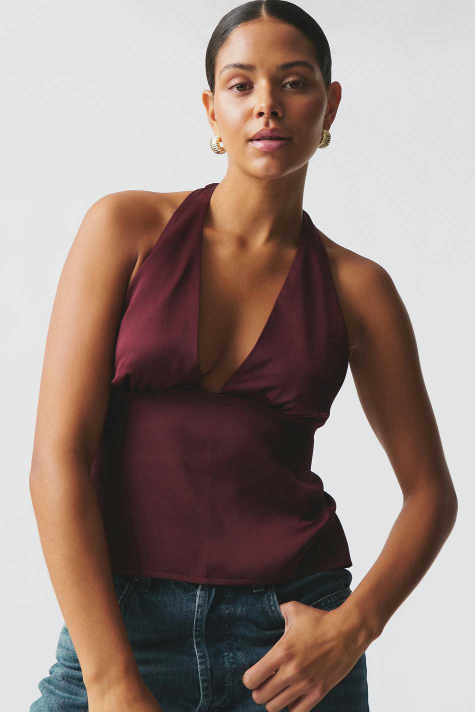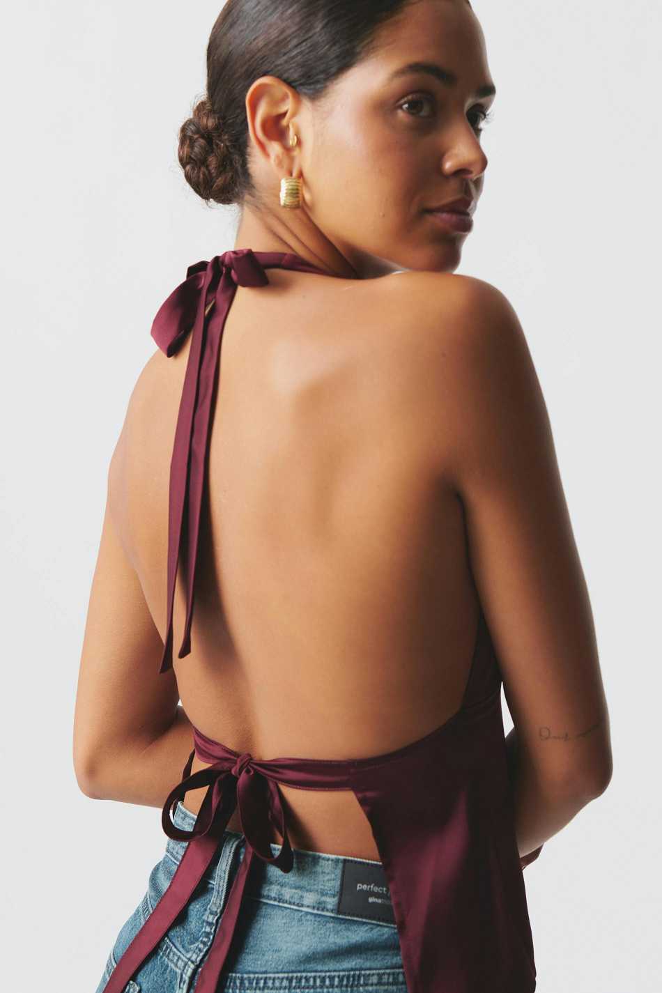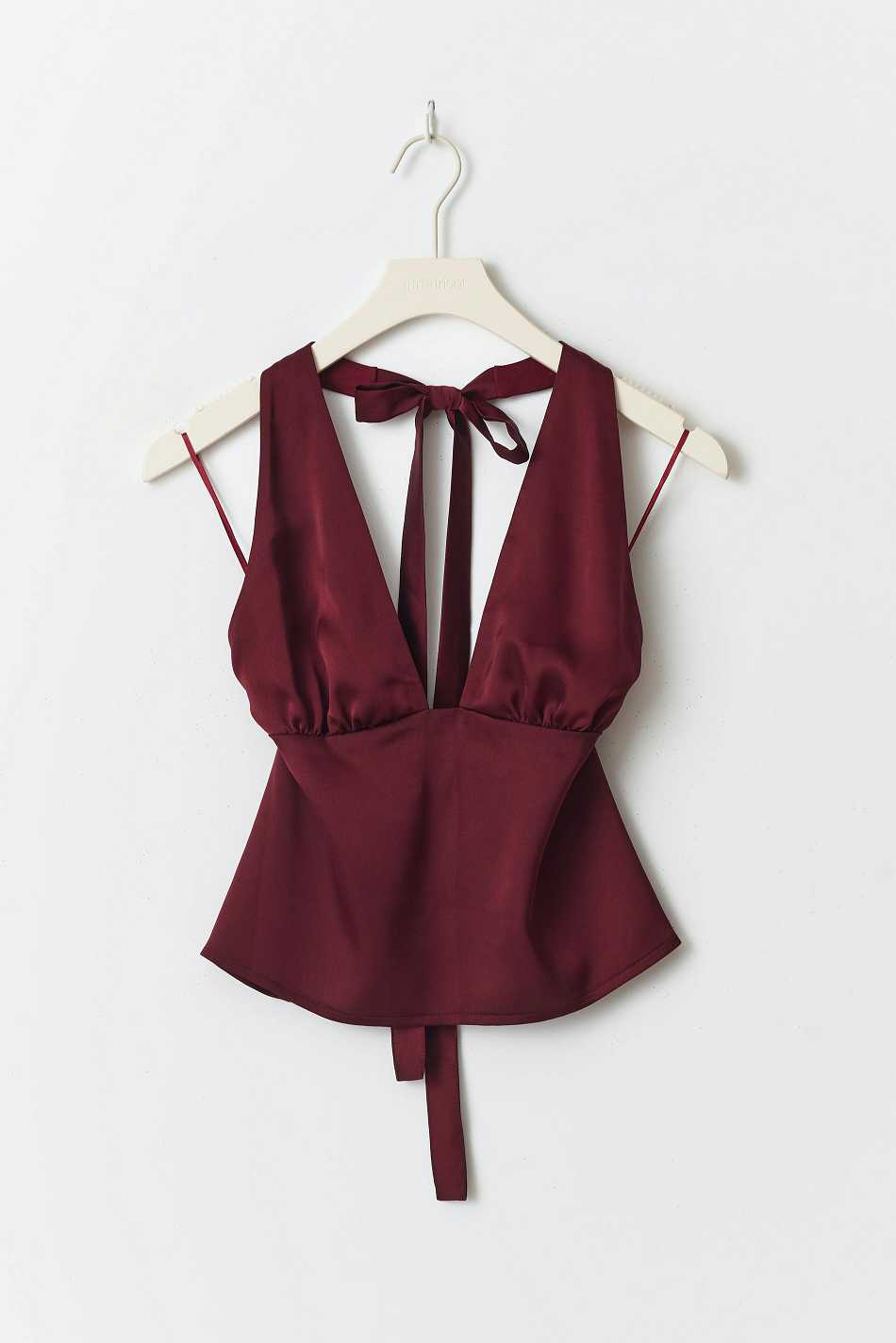 Halterneck top in satin with deep V-neck. The halterneck top is maroon and has gathering below the bust. It has open back, self-tie at the back and at neck, lined bust and soft, shiny quality.