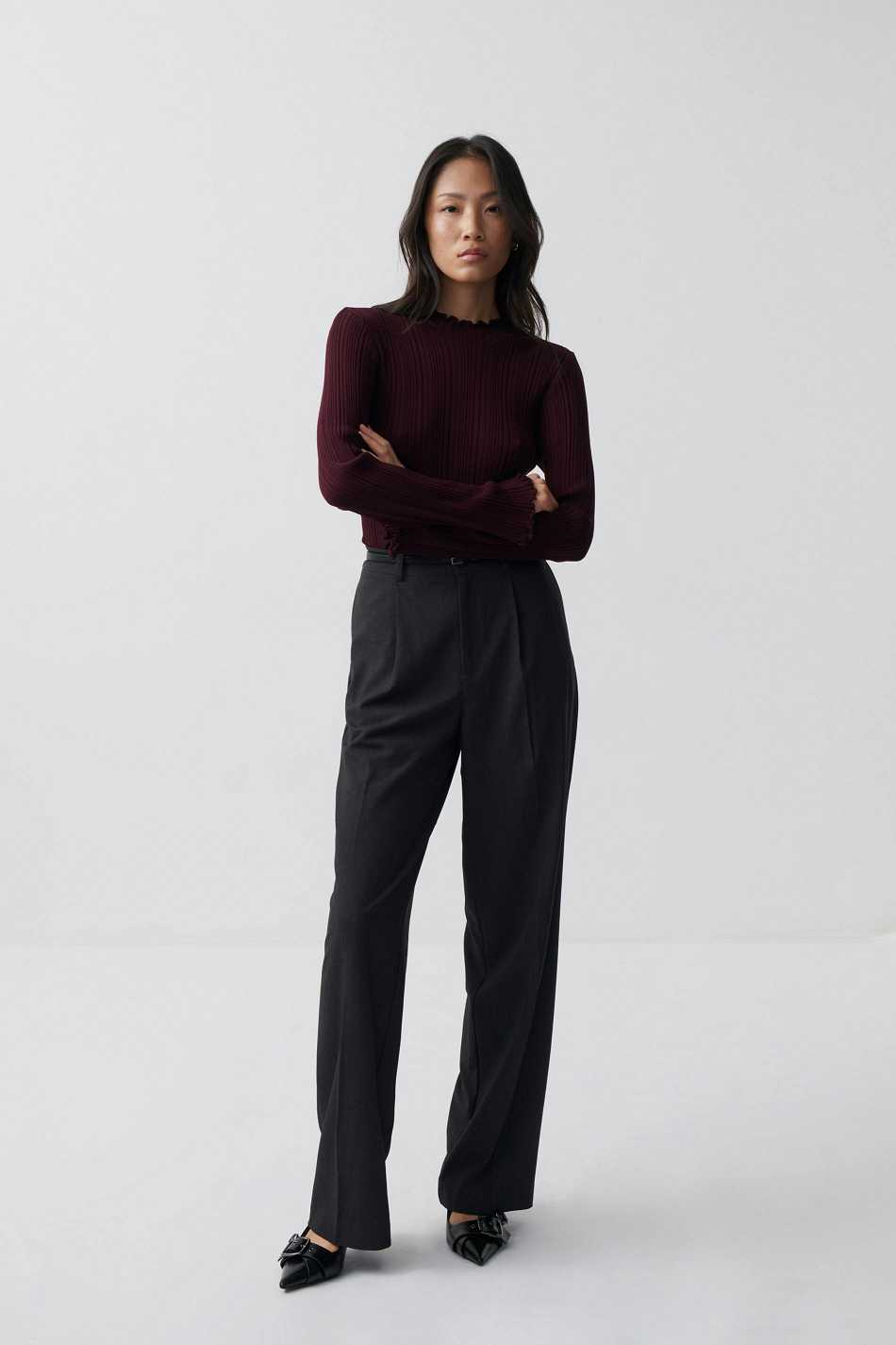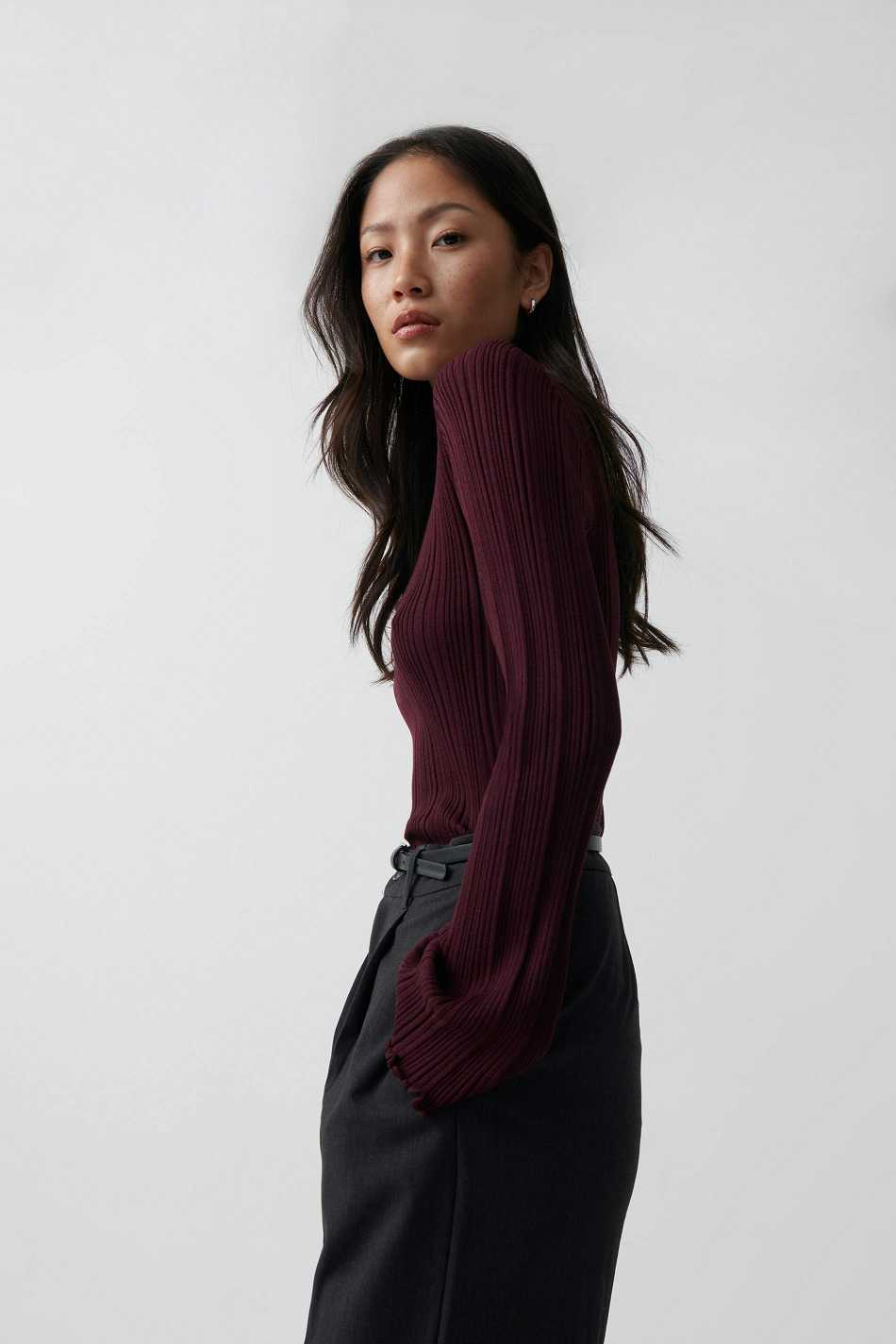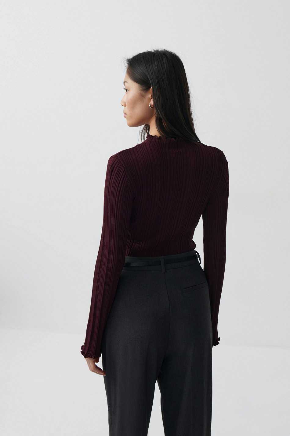 Pleated turtleneck top with figure-hugging fit. The top is wine and has high neck. It has long sleeve and overlocked hem.