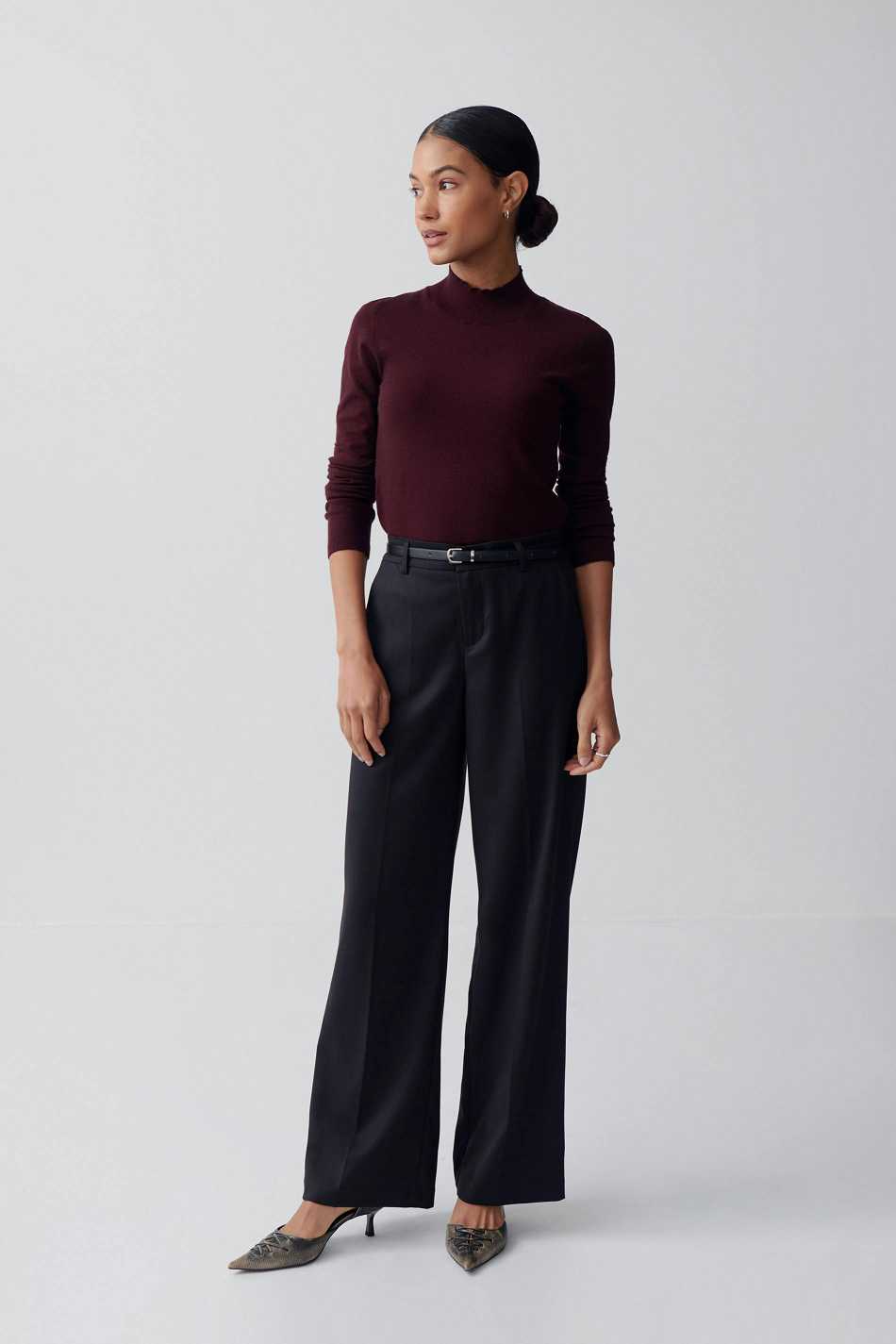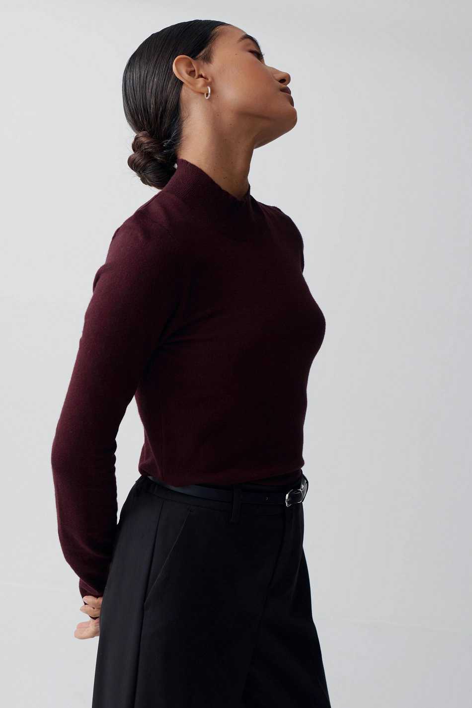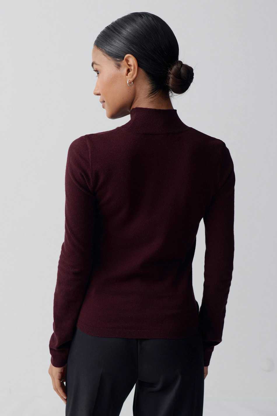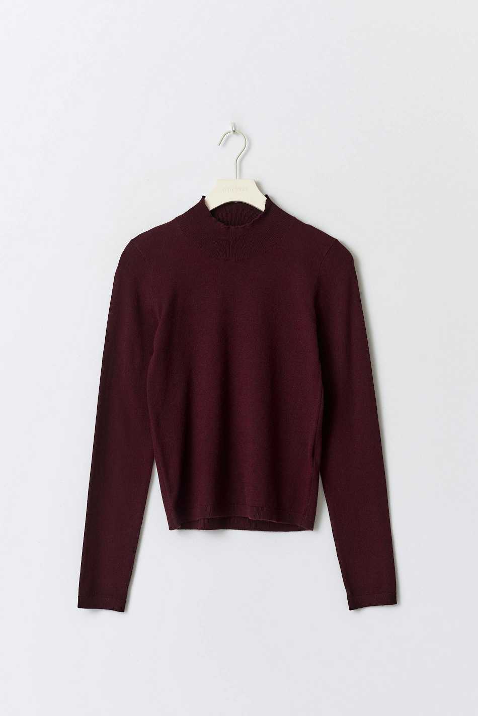 Knitted top with turtleneck. The top is wine and has figure-hugging fit. It has long sleeve and rib knit at the bottom.