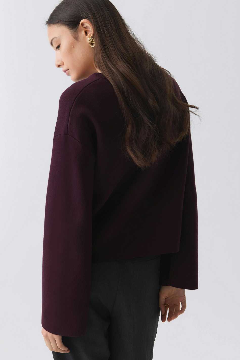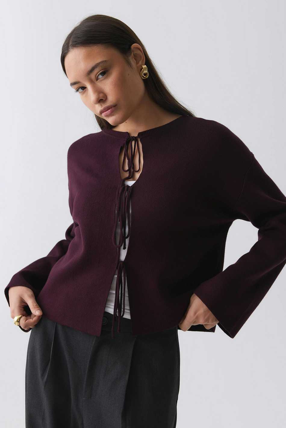 Soft knit cardigan with knot closure at the front. The cardigan is wine and has long sleeve. It has round, ribbed neckline and dropped shoulder.