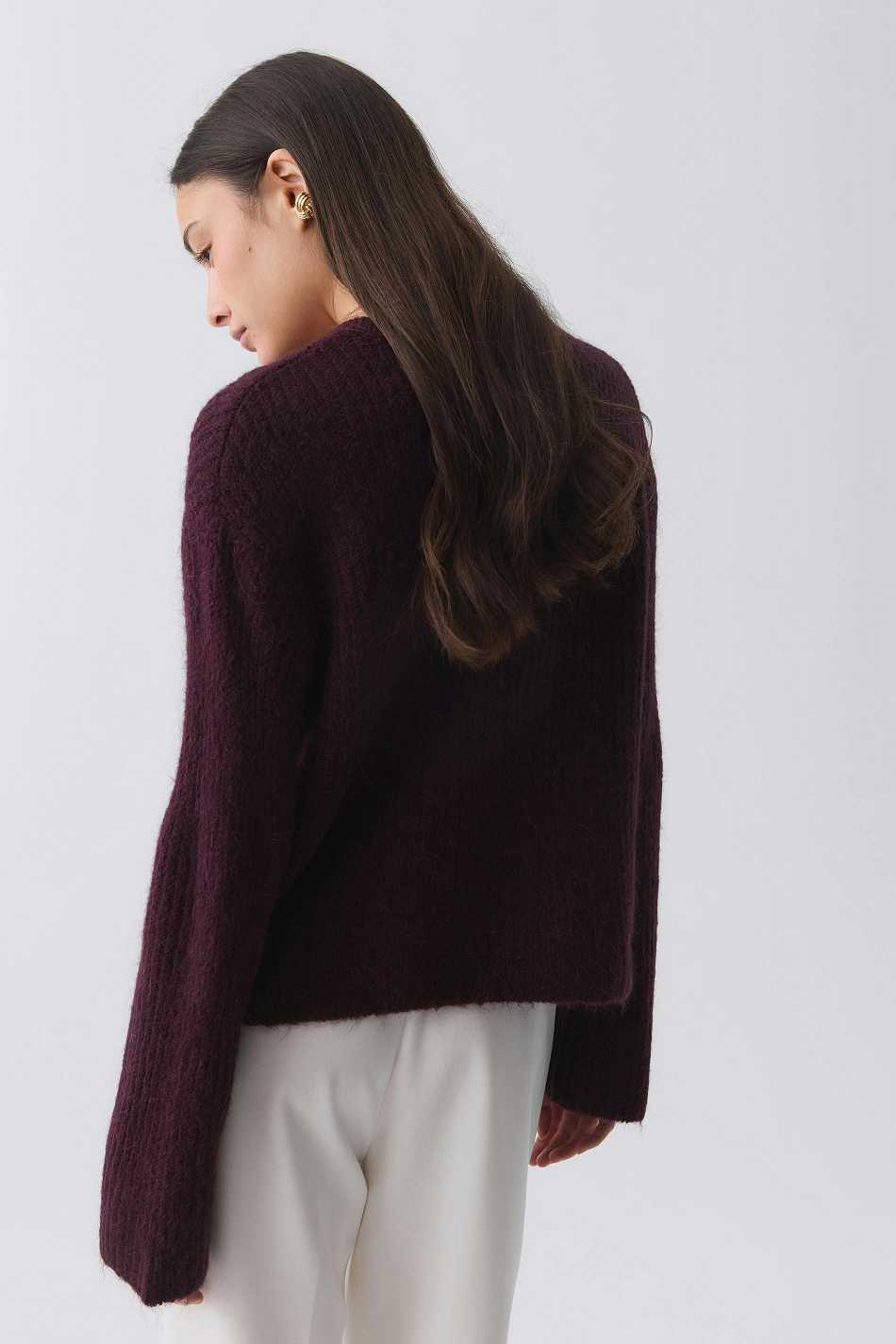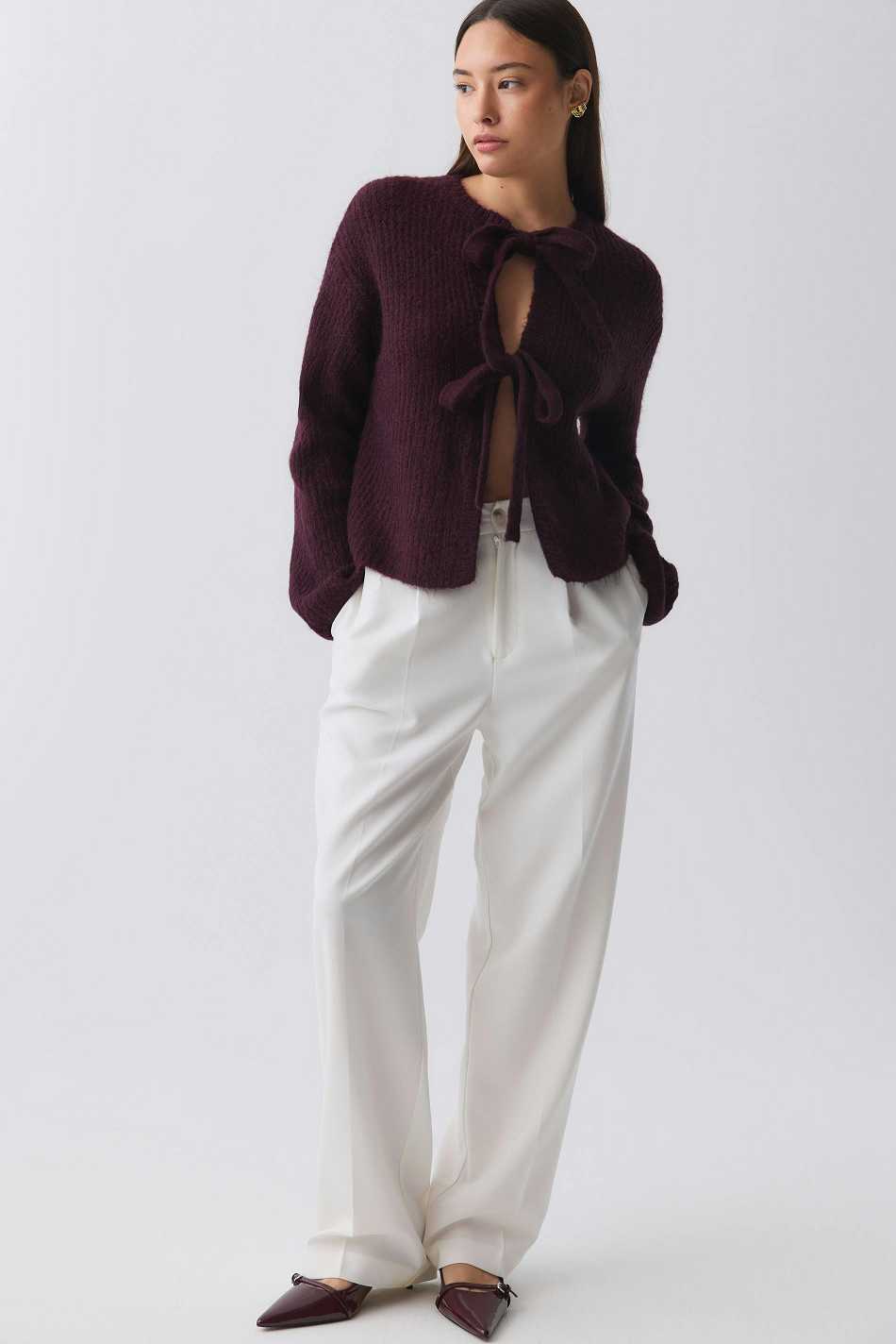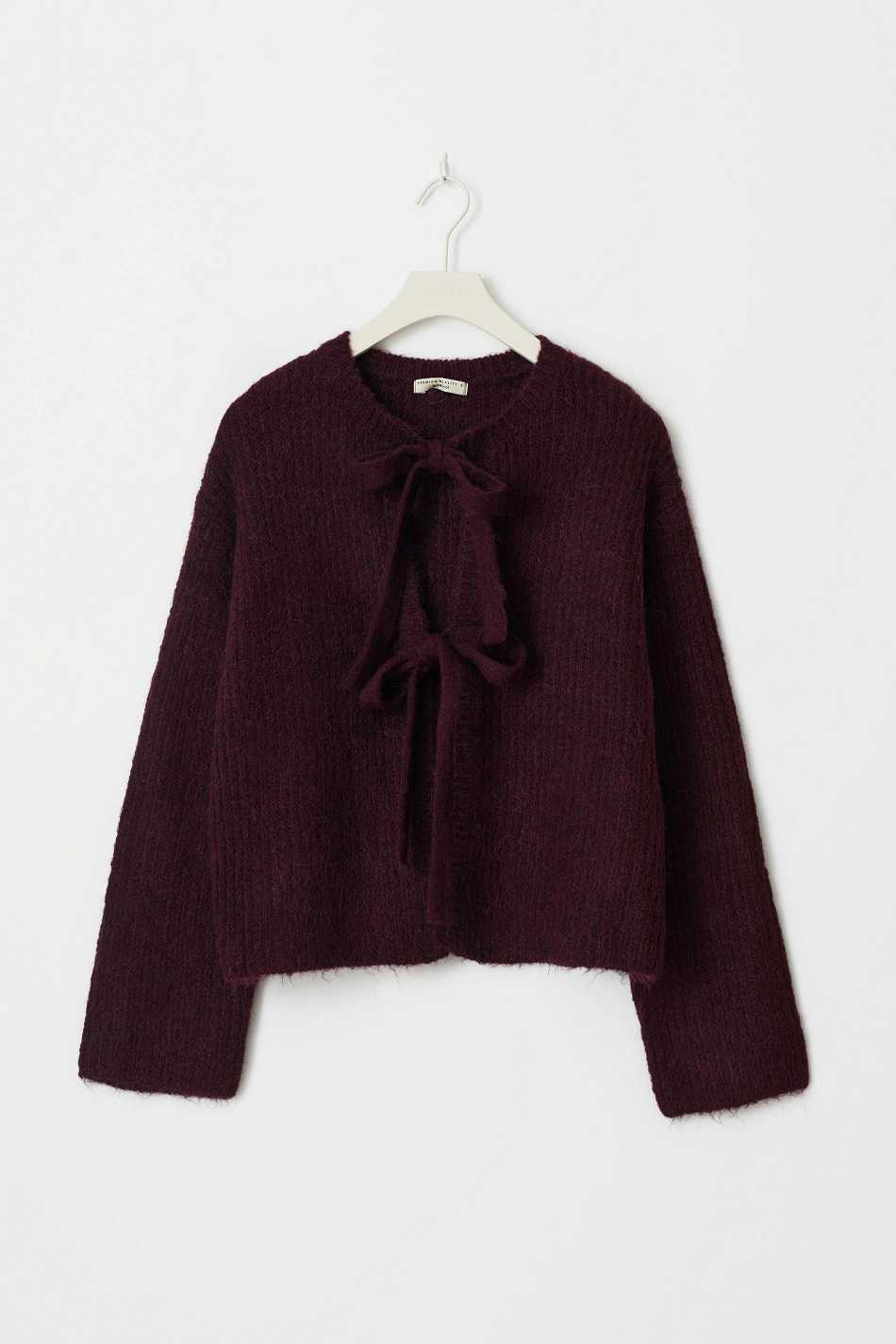 Knit cardigan with string tie closure at the front. The cardigan is wine and has oversize fit. It has round neckline and long sleeve.