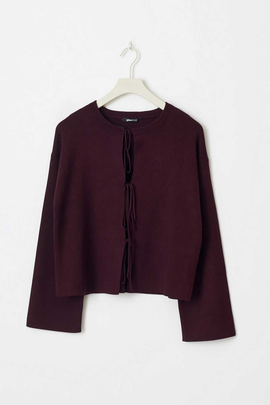 Soft knit cardigan with knot closure at the front. The cardigan is wine and has long sleeve. It has round, ribbed neckline and dropped shoulder.