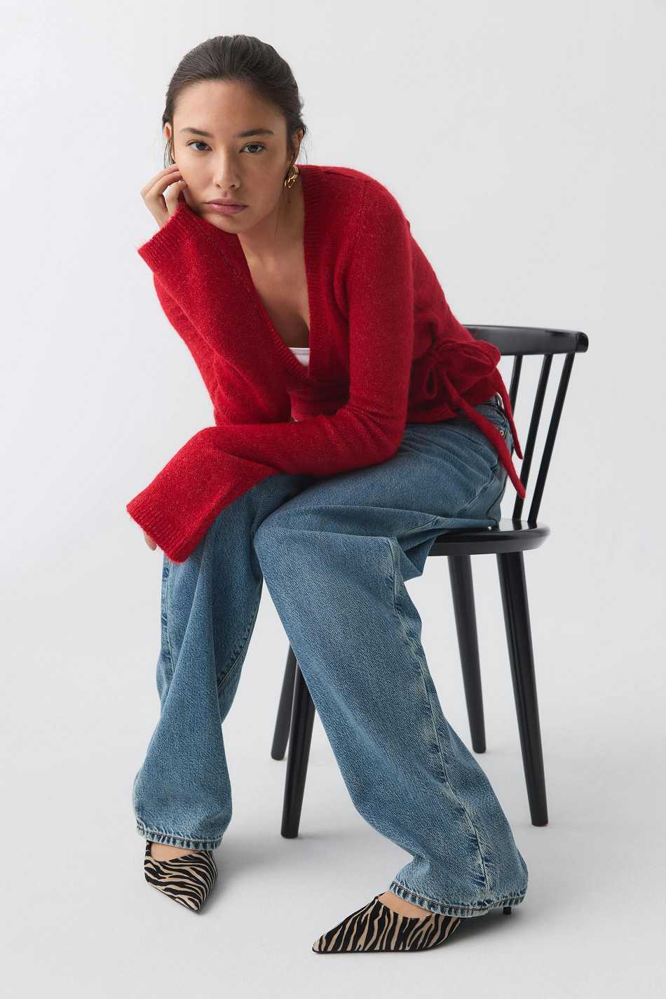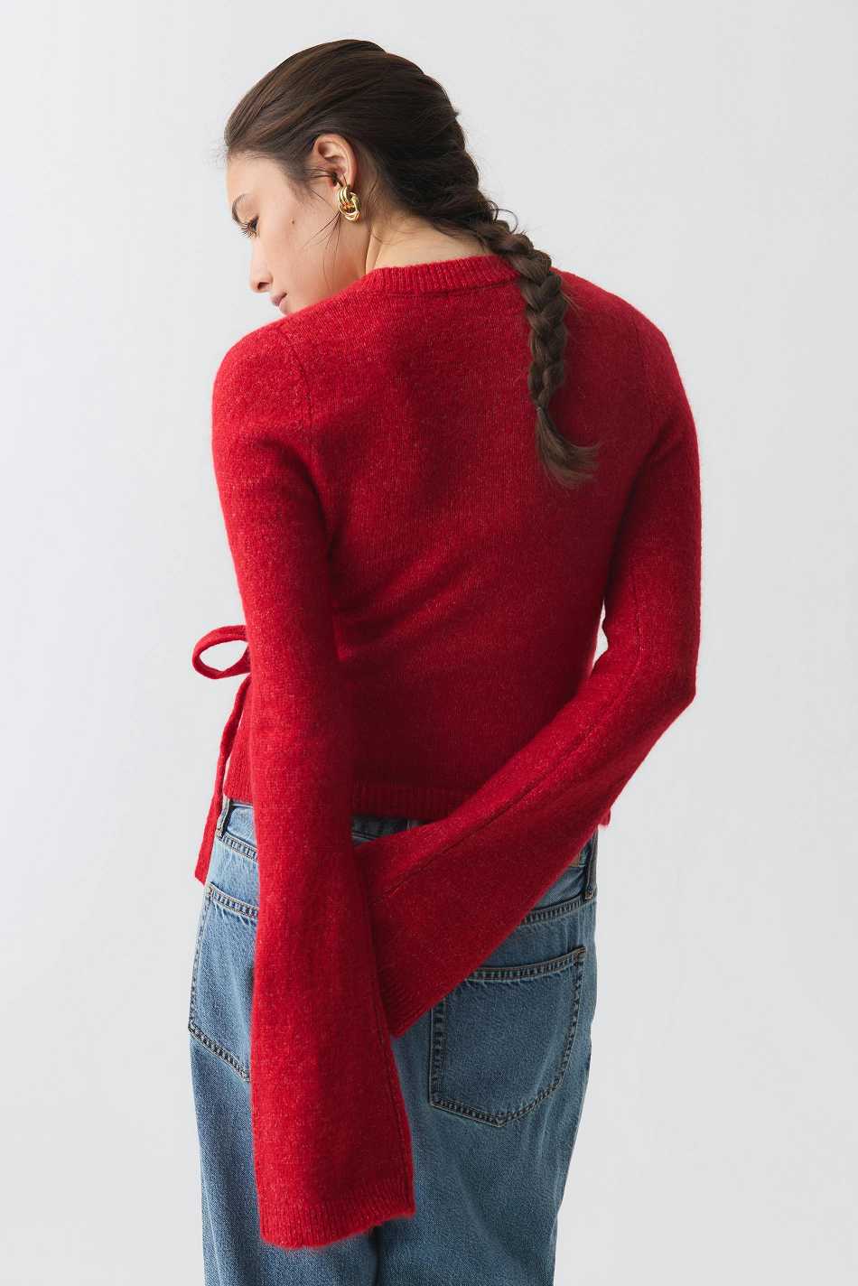 Knitted wrap cardigan with self-tie at the waist. The cardigan is red and has v-neck. It has regular fit and long sleeve.