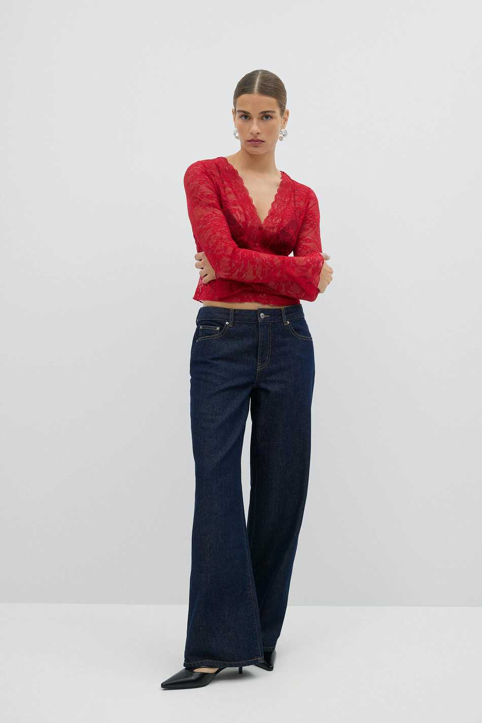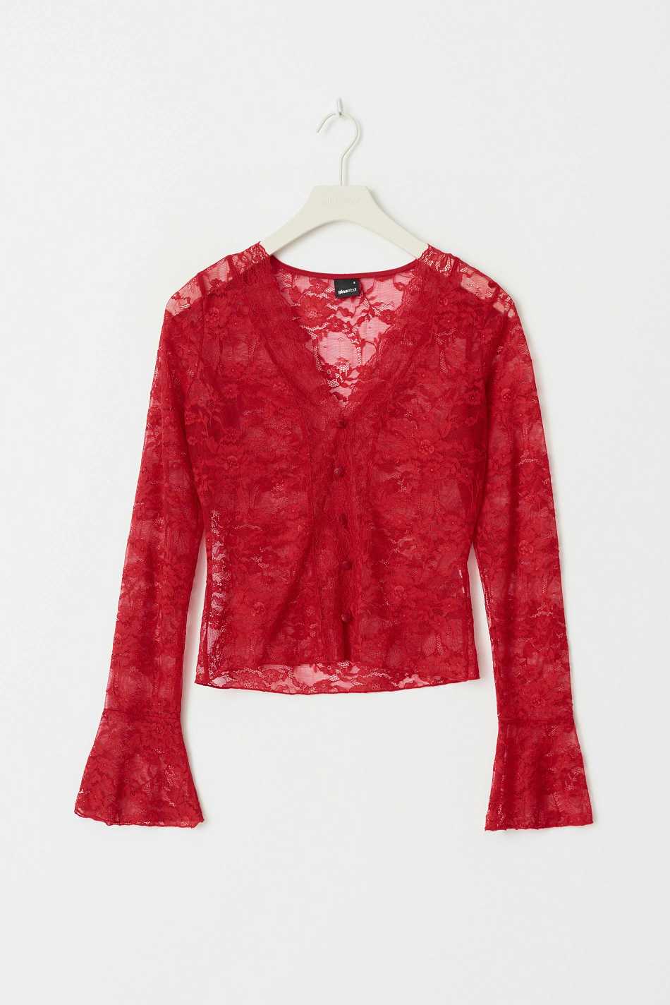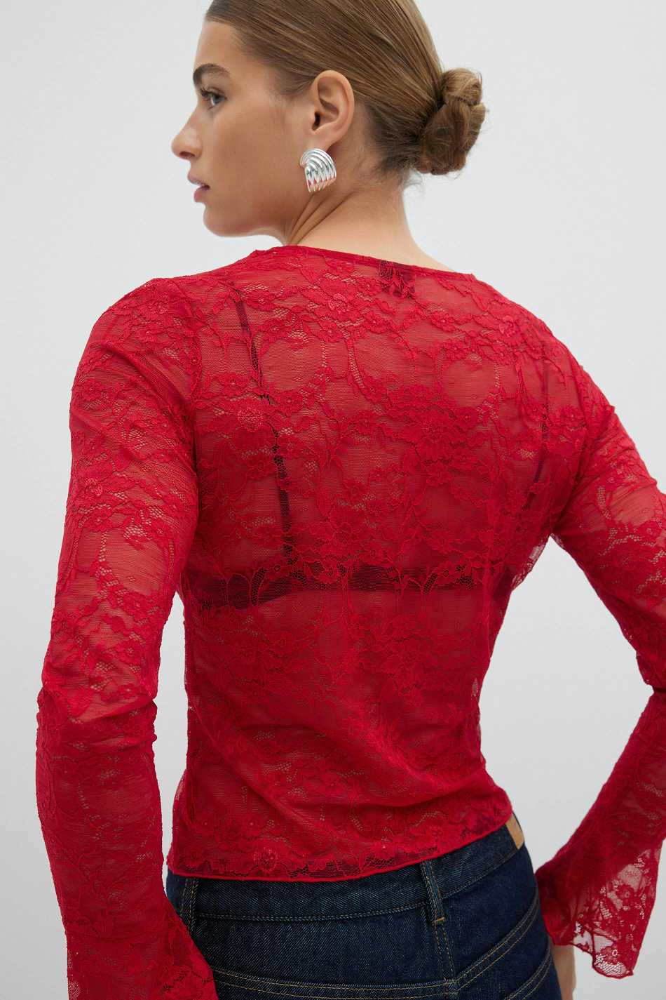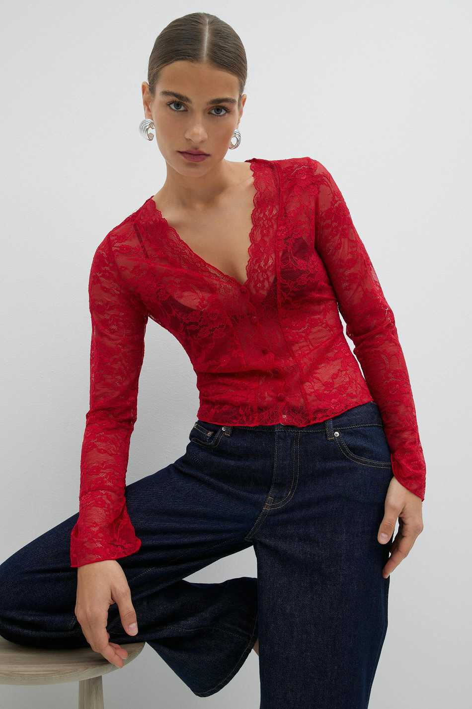 Long-sleeved lace top with buttons at the front. The top is red and has v-neck. It has lantern sleeve and regular length. Unlined.