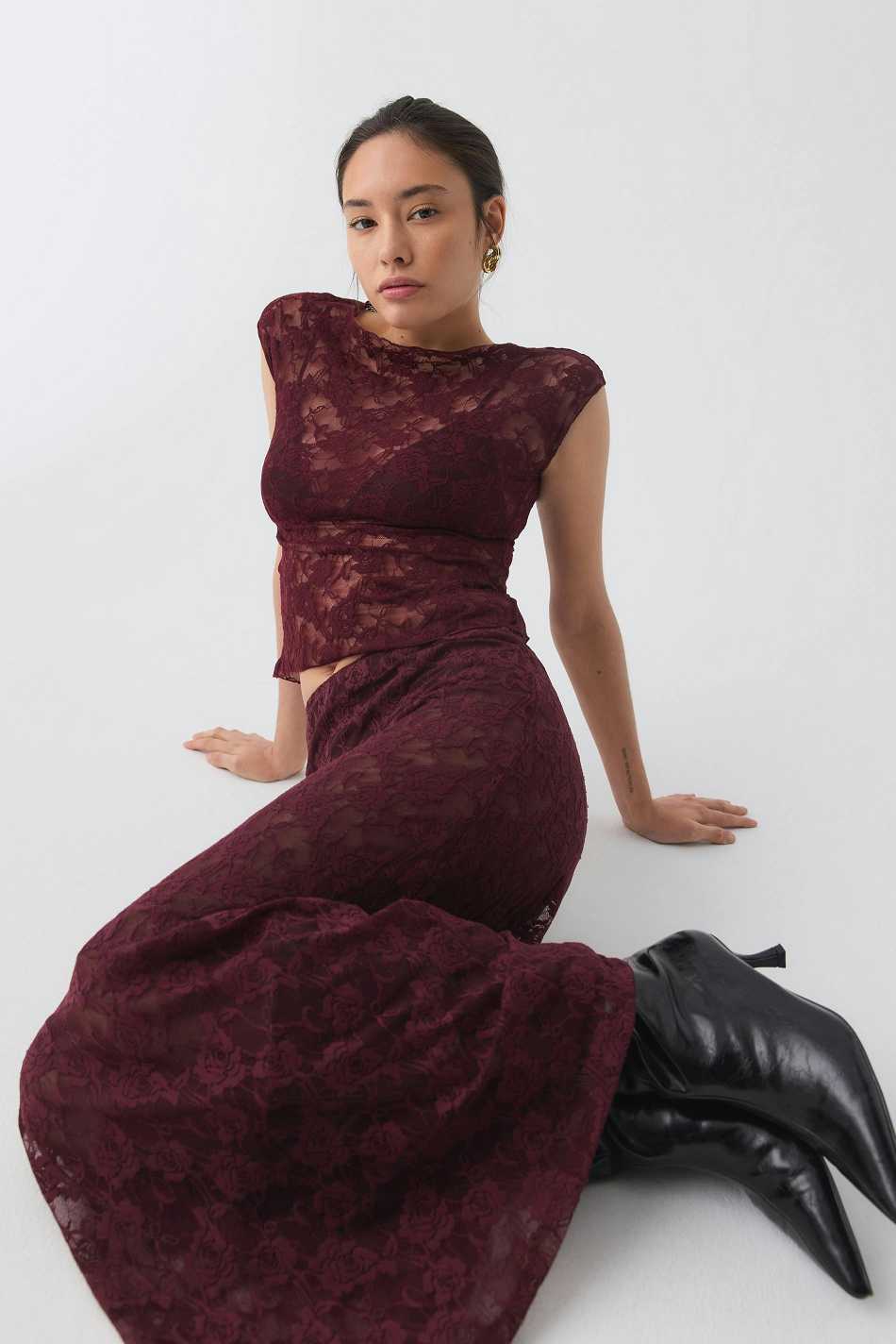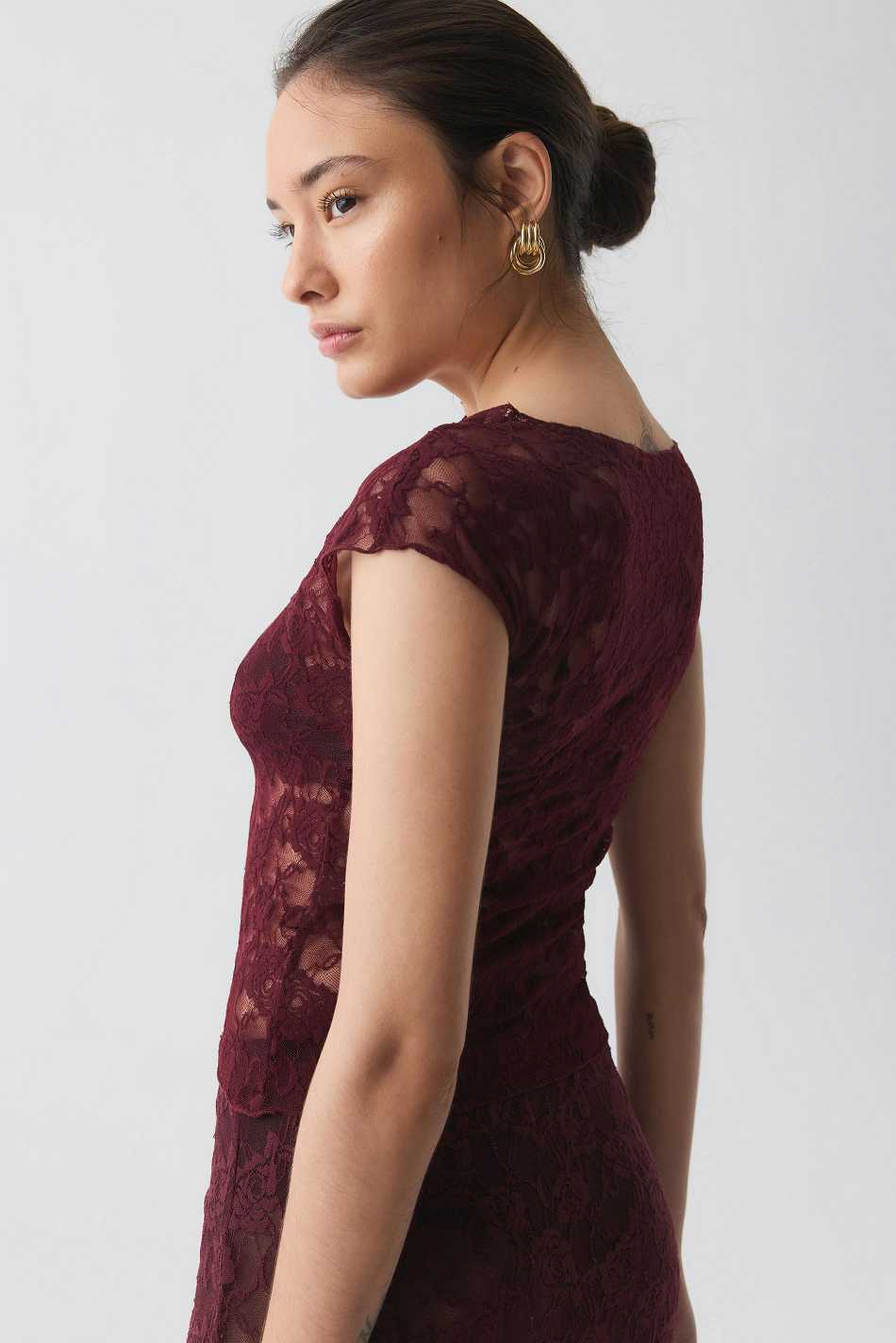 Short-sleeved lace top with high neckline. The top is wine and has figure-hugging fit. It has floral lace pattern and regular length. Unlined.