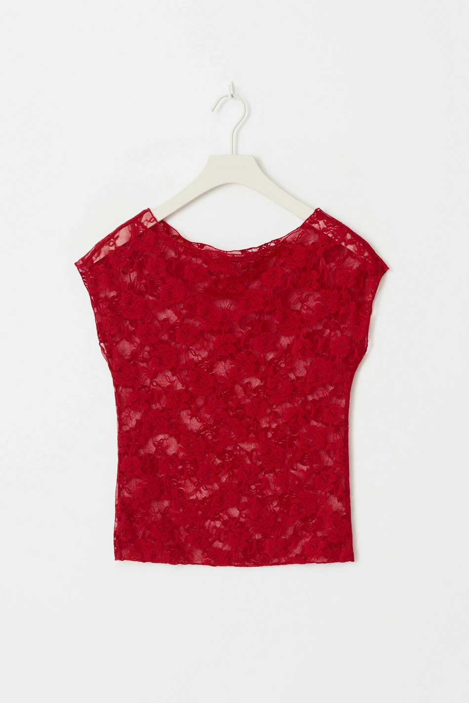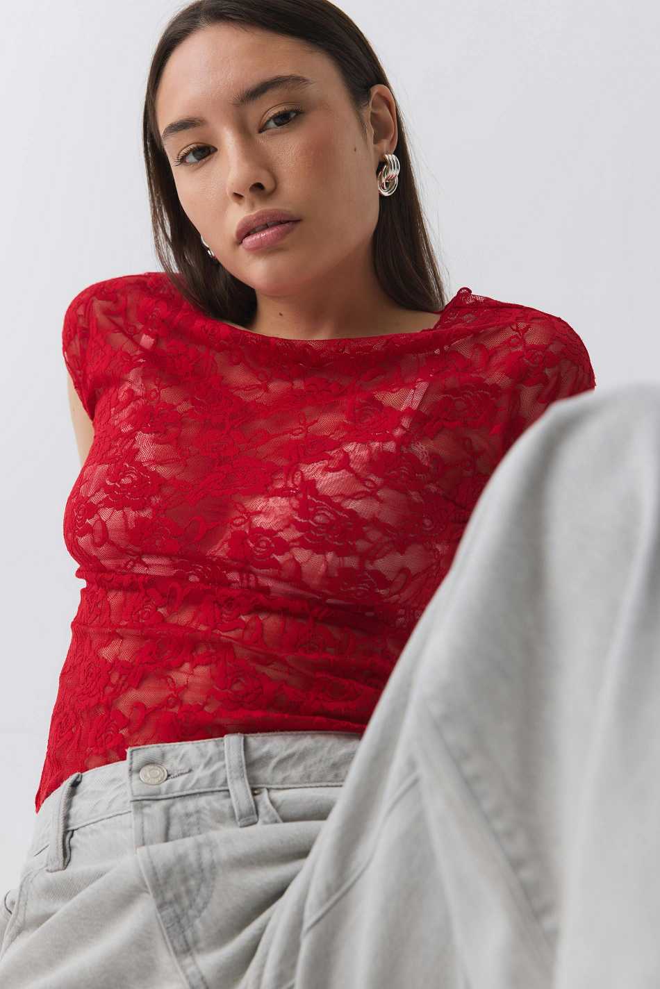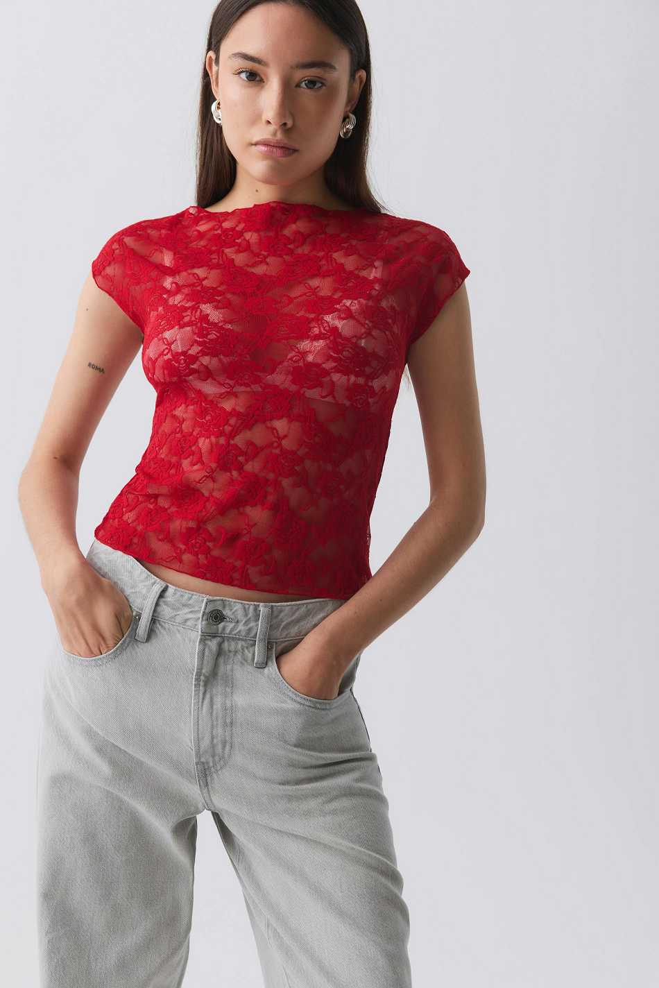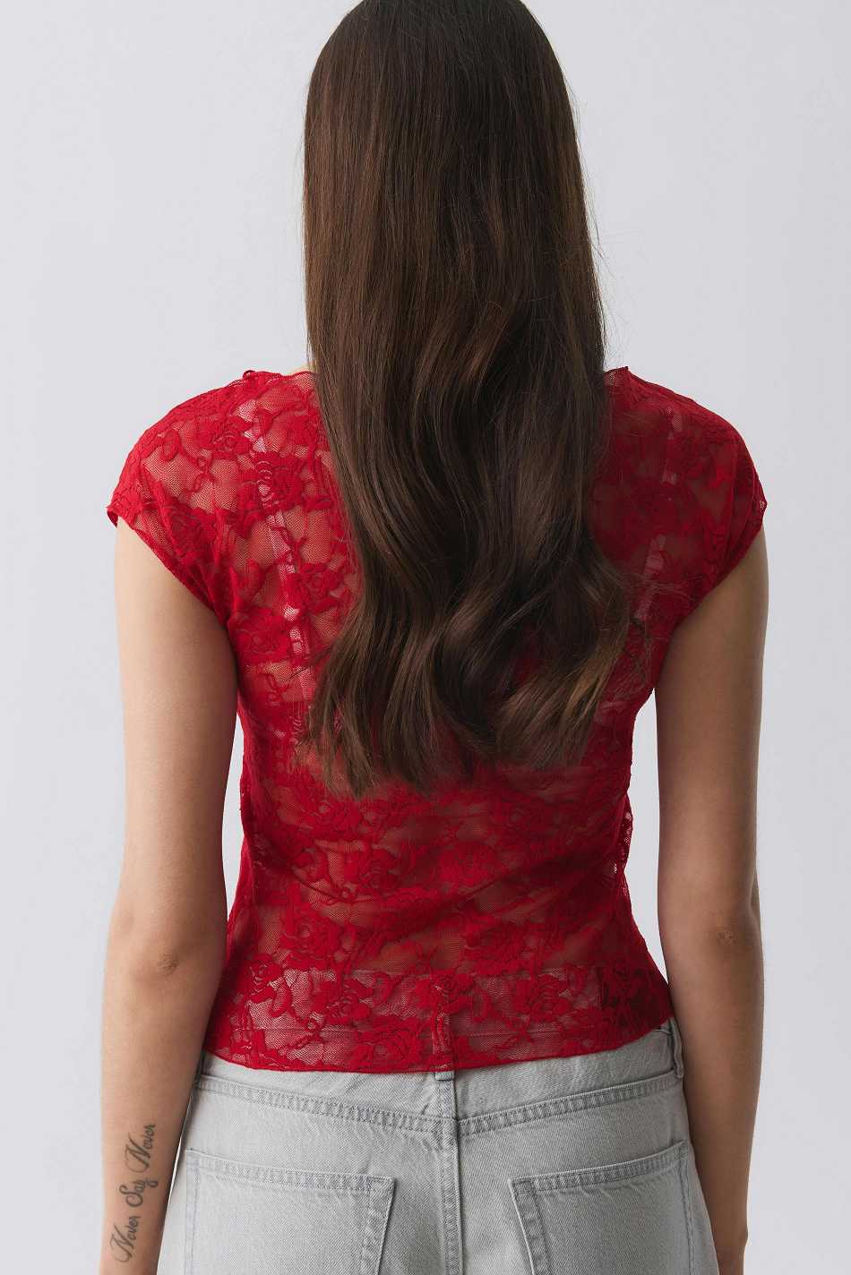 Short-sleeved lace top with high neckline. The top is red and has figure-hugging fit. It has floral lace pattern and regular length. Unlined.