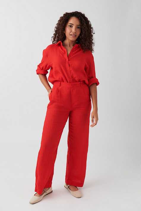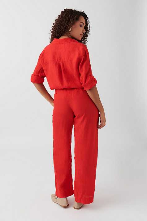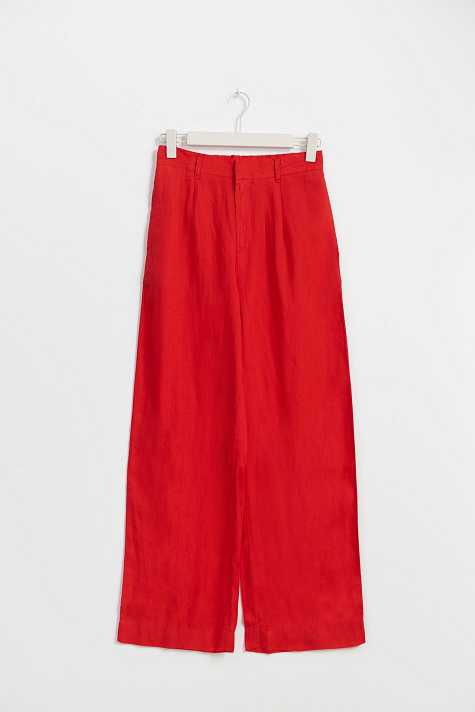 Linen trousers with loose-fitting style. The linen trousers are red and have pleats at the front. They have straight legs, elastic at the back of the waist, belt loops, side pockets and a welt pocket at the back.