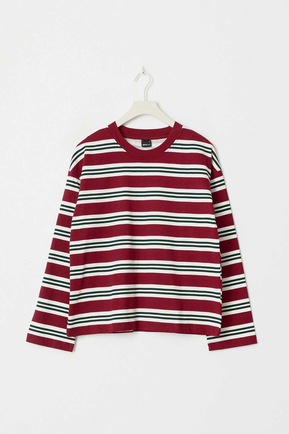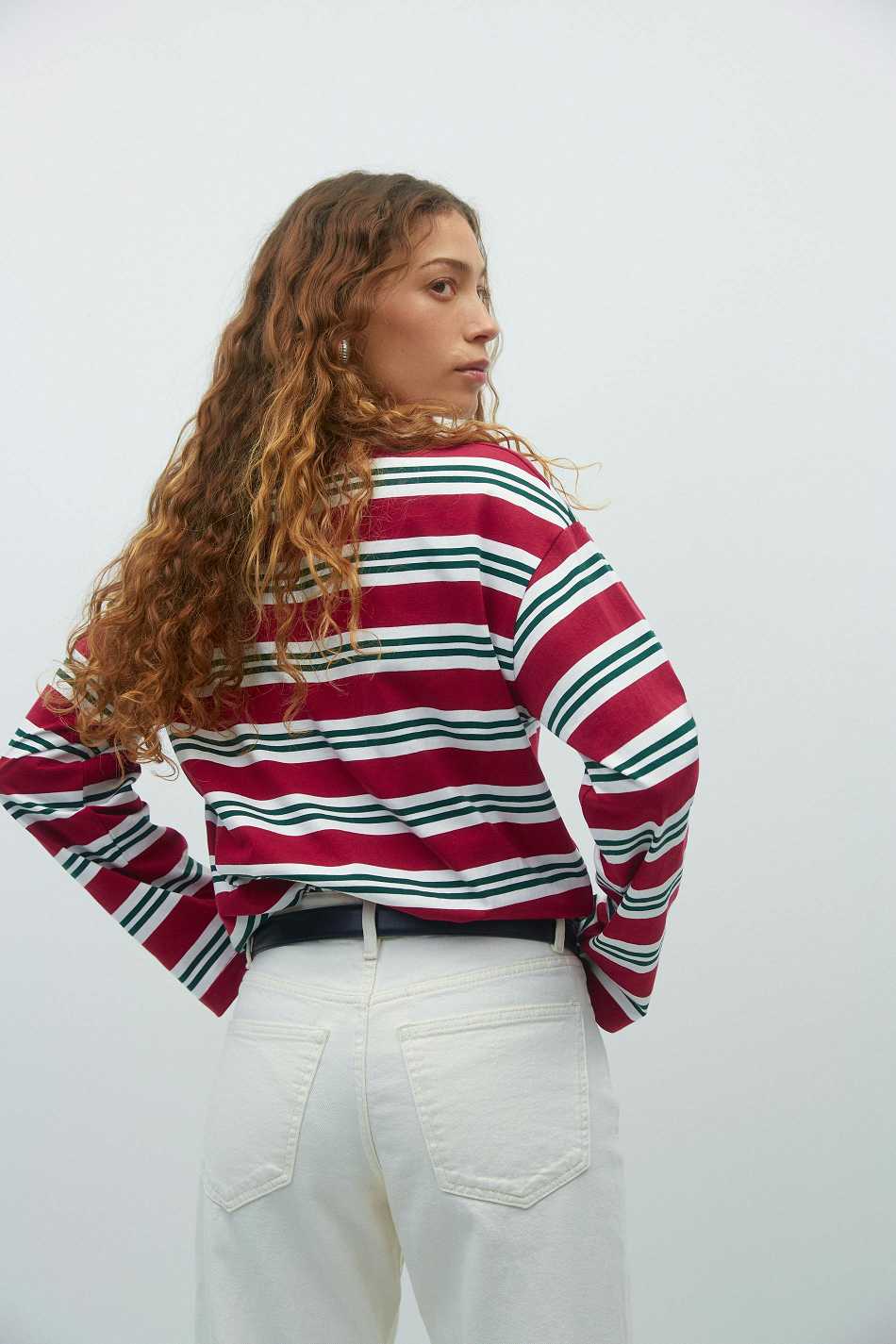 Striped long sleeve tee with oversize fit. The t-shirt is red and has round neckline. It has dropped shoulder, ribbing on the neckline and regular length.