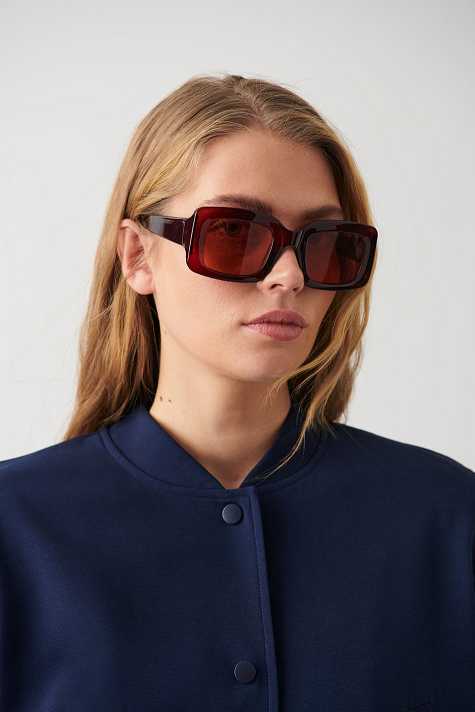 Rectangular sunglasses with wide plastic frames in 100% recycled plastic. The sunglasses is red and has glass with UV400 protection.
