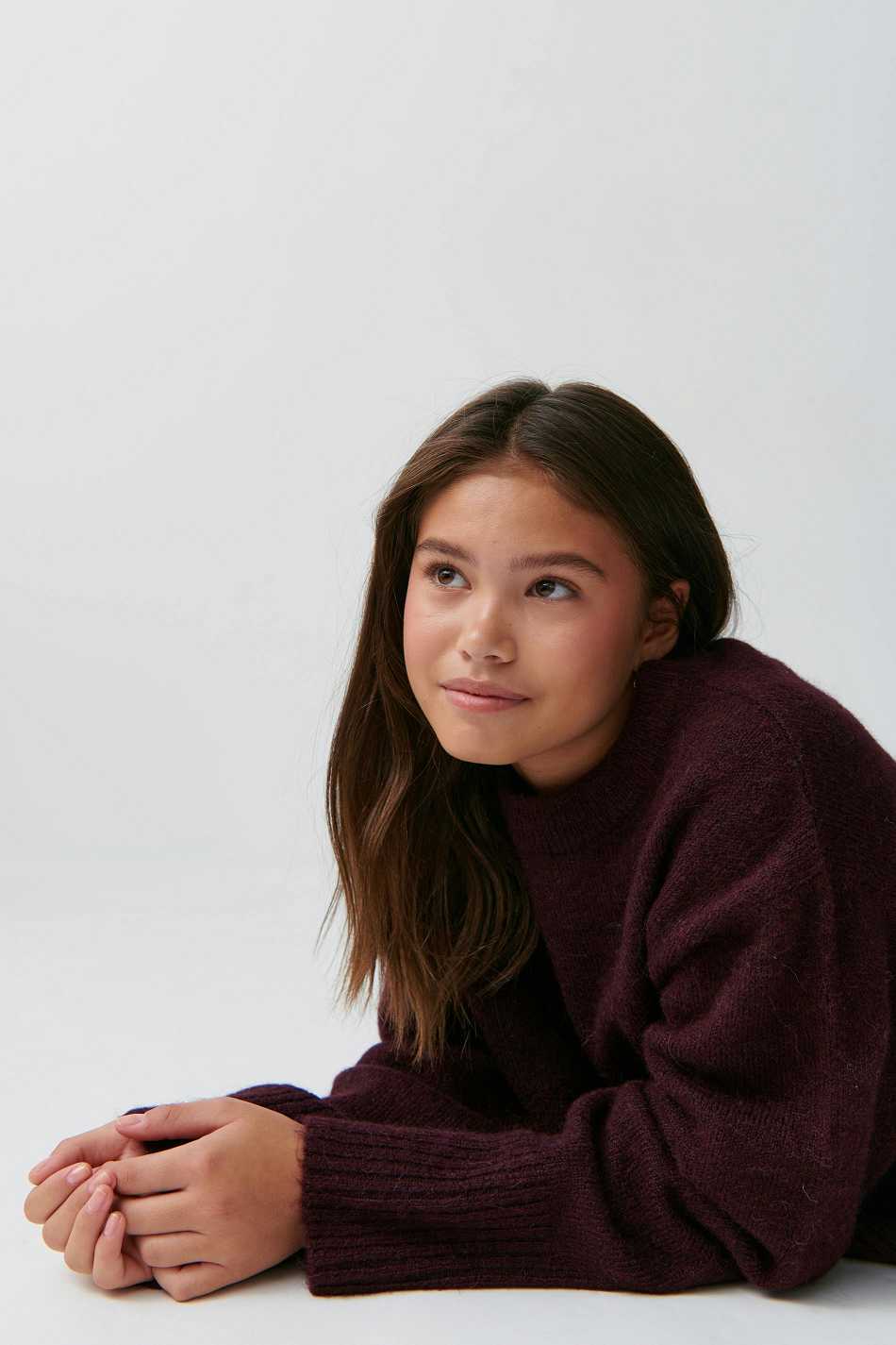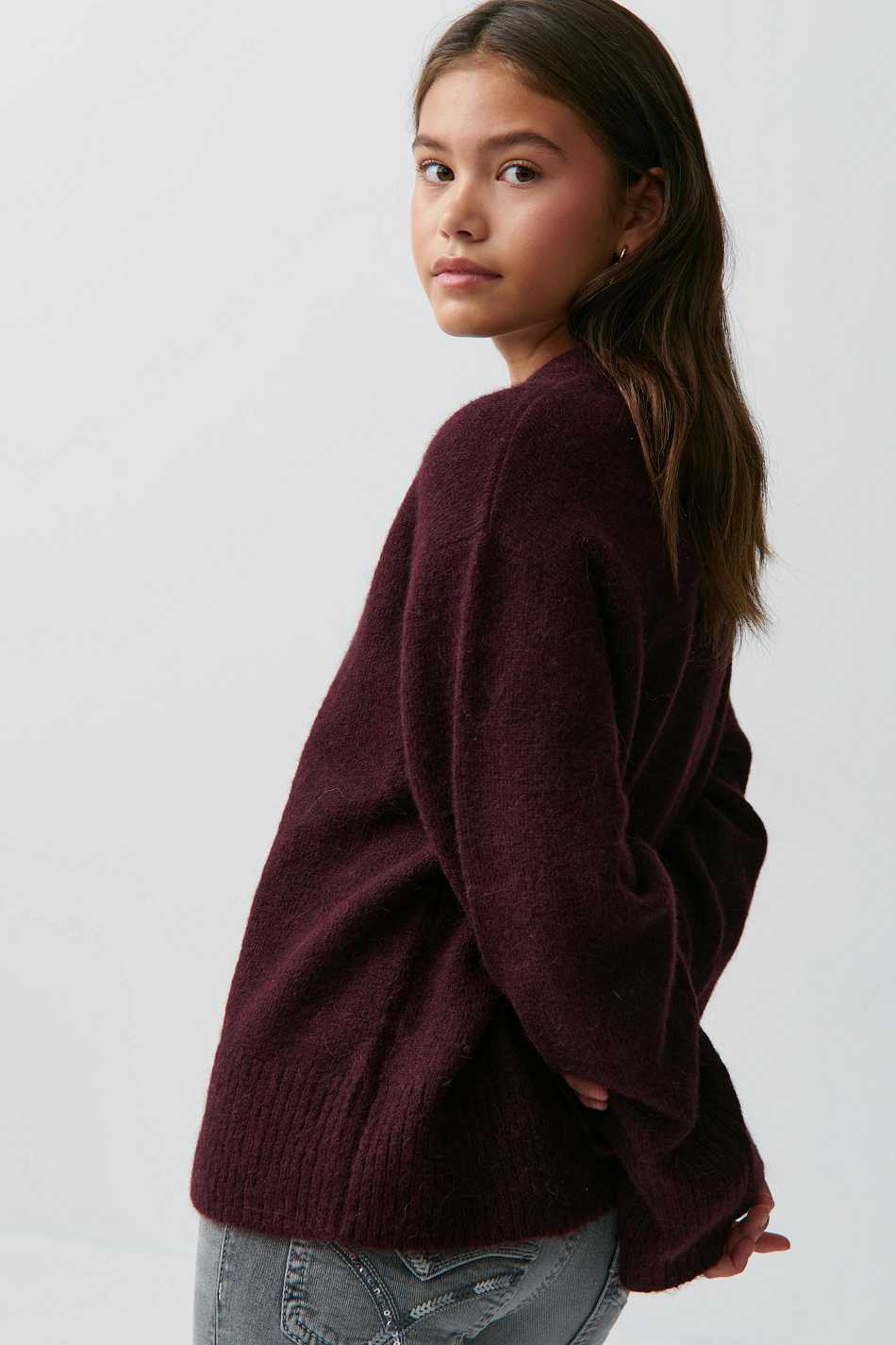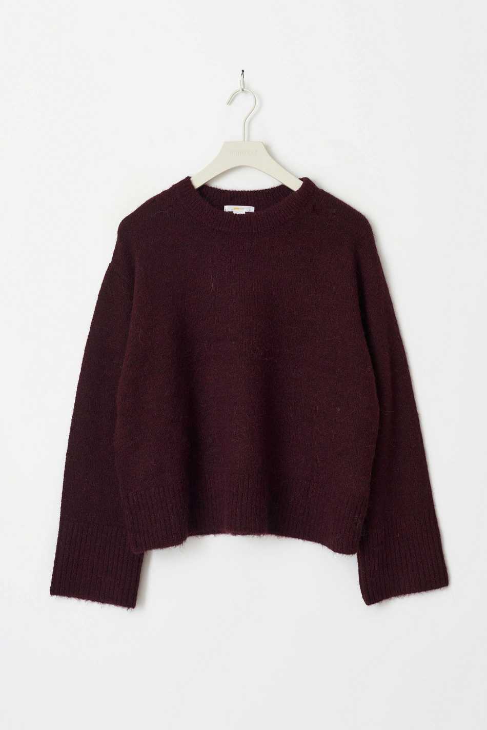 Knitted sweater with oversize fit. The sweat is wine and has round neckline. It has long sleeve and wide ribbing at sleeve ends and at the bottom.