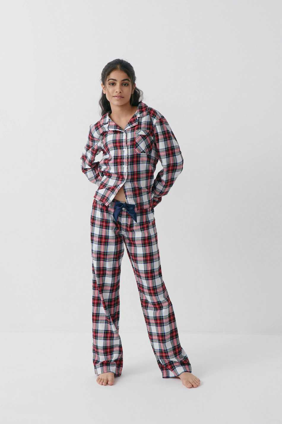 Checked pyjama tracksuit trousers in flannel with bow at the front. The pyjama tracksuit trousers are red and have low waist. They have regular fit, straight legs and elastic at the waist.