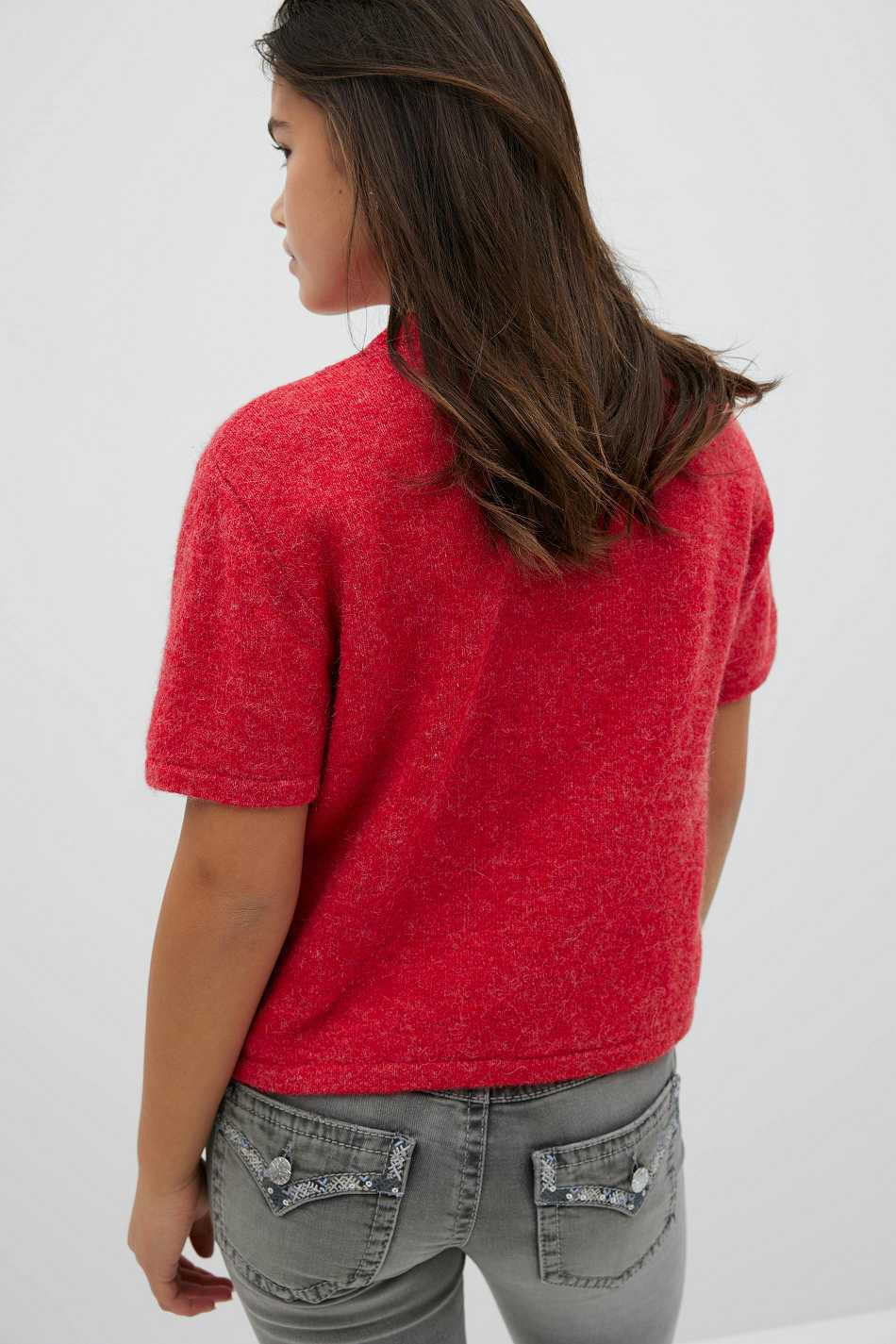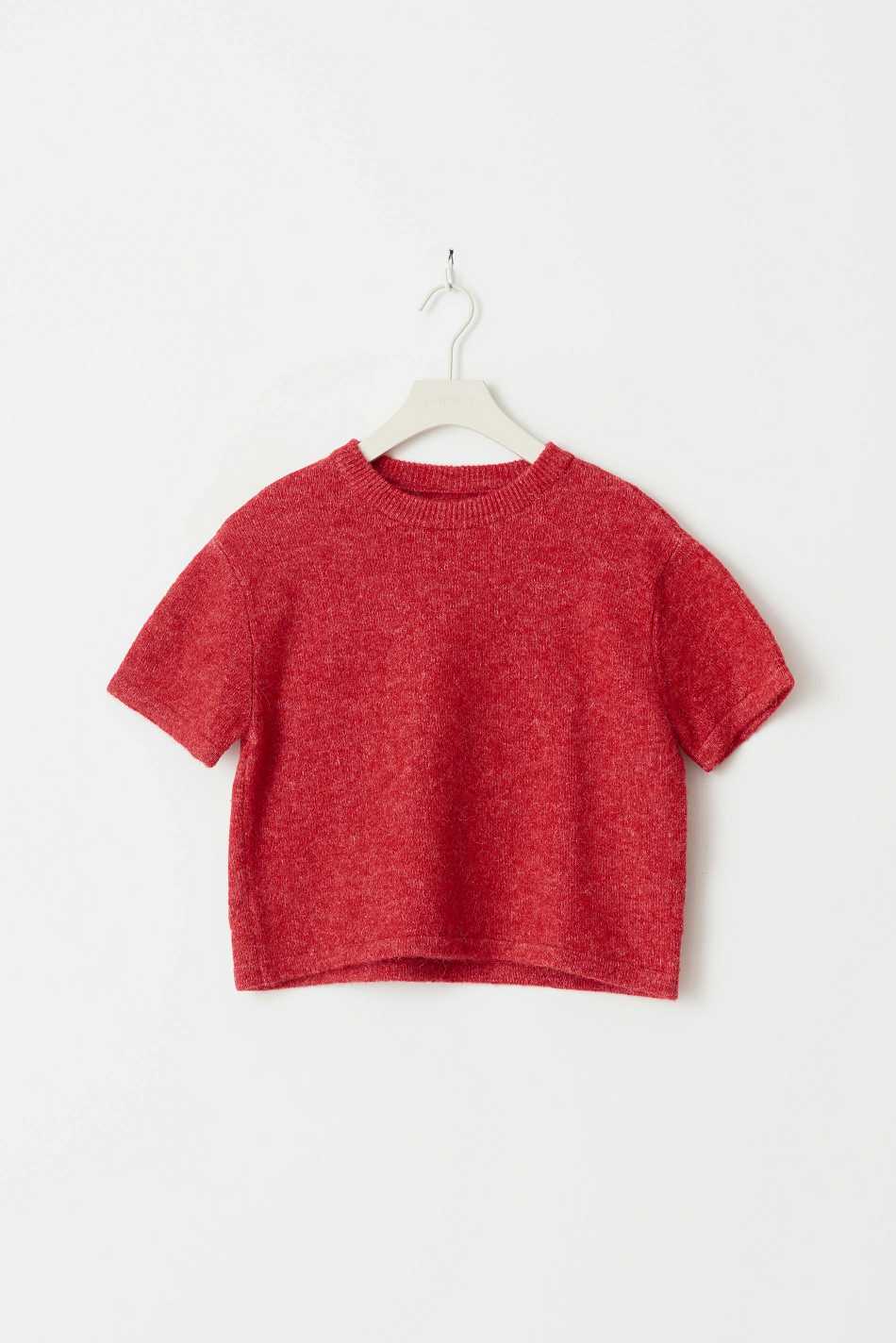 Short-sleeved knitted sweater in wool blend with loose-fitting style. The sweat is red and has soft quality. It has round neckline and rib knit at sleeve ends and at the bottom.