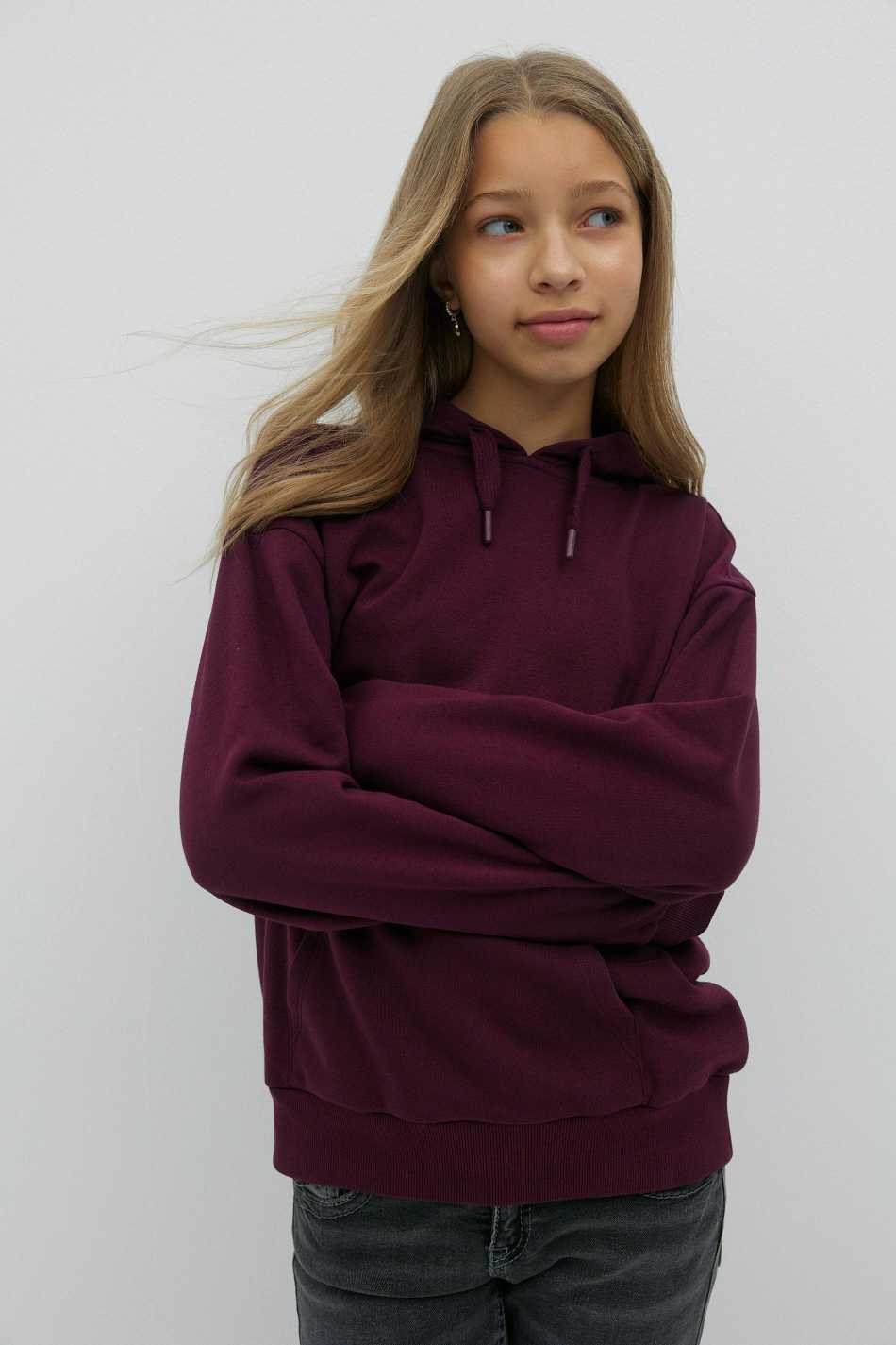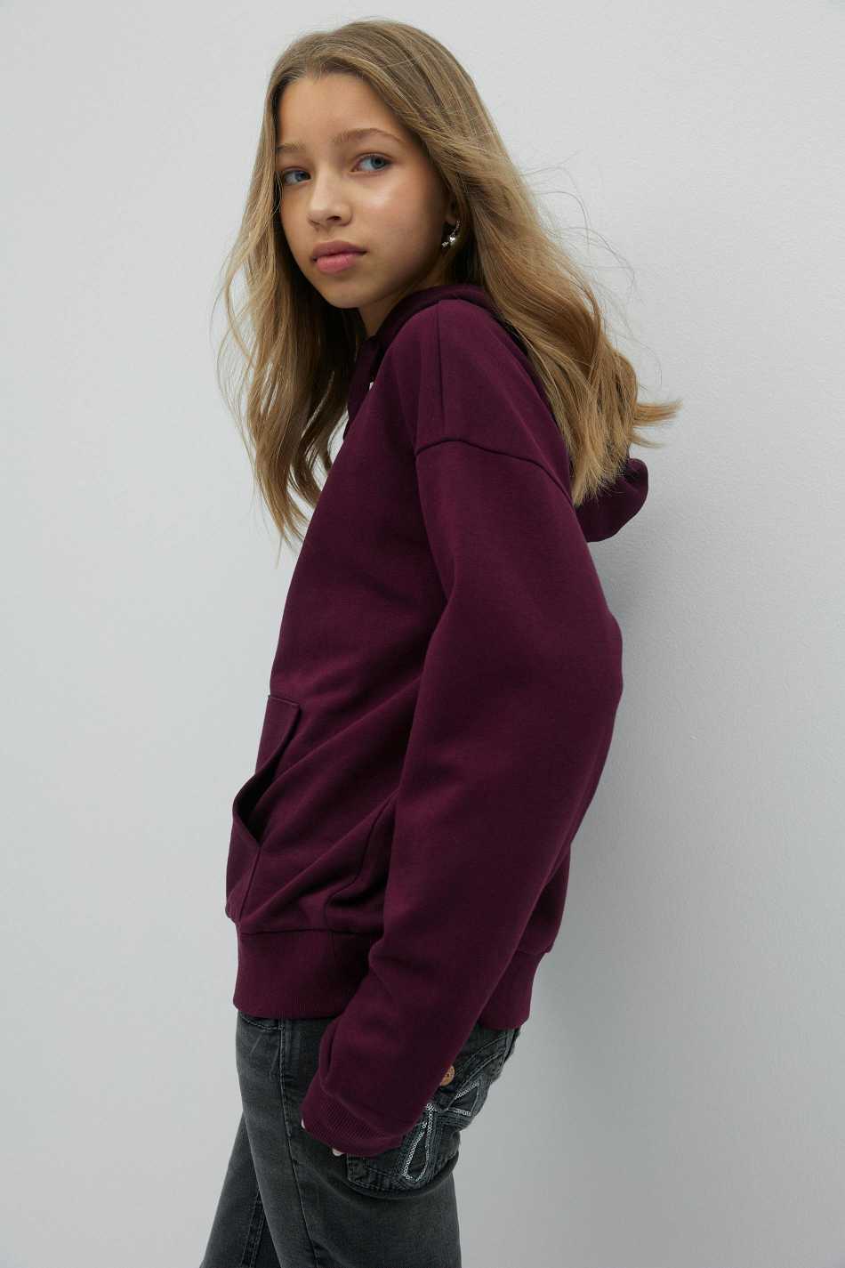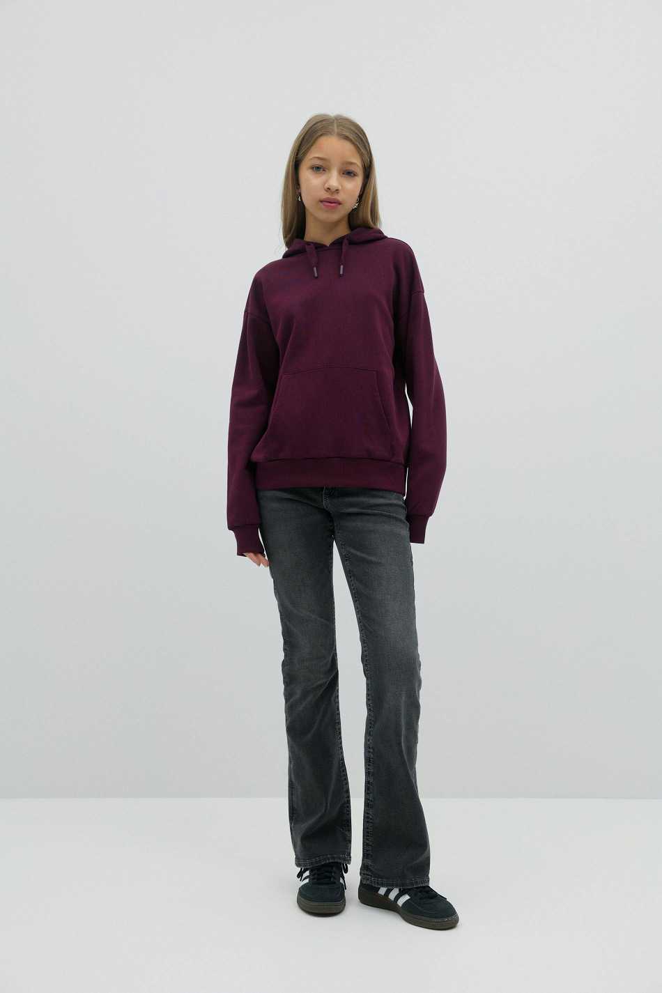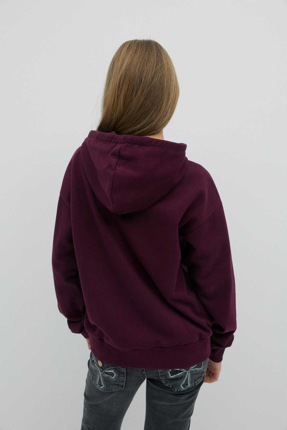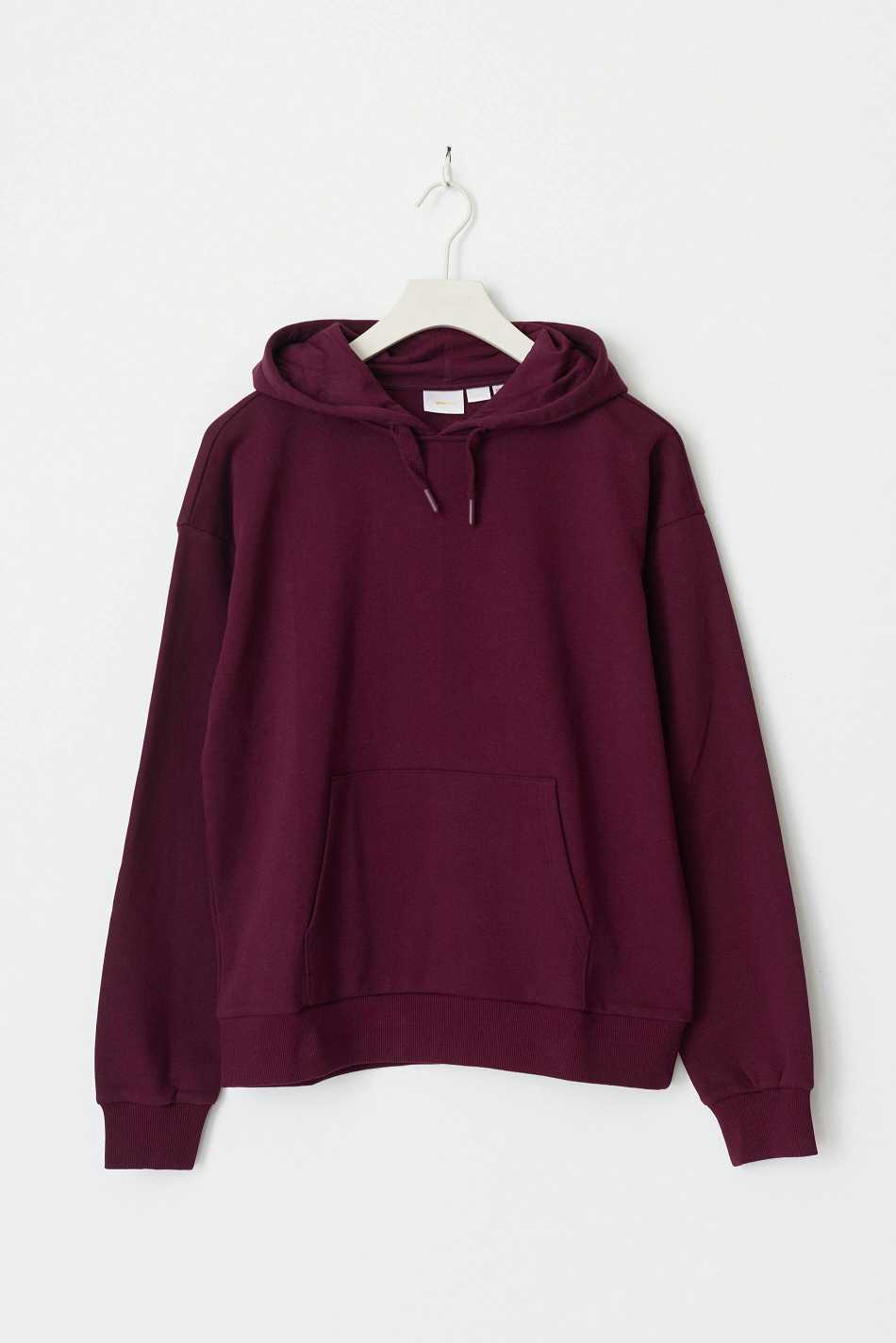 Hoodie with oversize fit. The hoodie is wine and has lined hood with drawstrings. It has kangaroo pocket at the front, long sleeve and ribbing at sleeve ends and at the bottom.