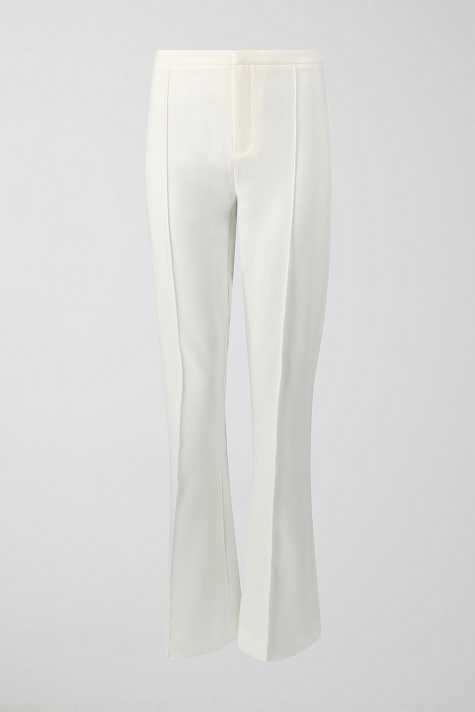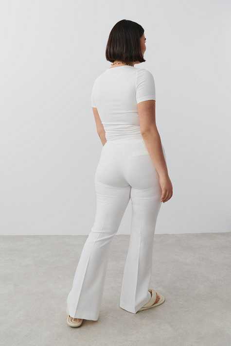 Trousers with a stretch and mid waist. The trousers are white and have slim fit. They have flared legs, side pockets, fake pockets at the back and zip fly.