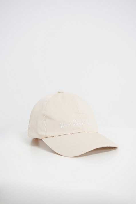 Cap in cotton with embroidered text. The cap is beige and has adjustable tab with metal buckle at the back.